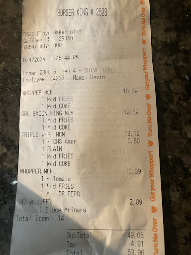 Read moreDO NOT EAT AT BURGER KING IN GAFFNEY, SC. THE FOOD & SERVICE WAS HORRIBLE. I give this Burger King in Gaffney, SC 0 (ZERO) stars. I was so excited to try the new Taco that was advertised as having a light & crispy shell. That is not what I got. First of all I asked the lady who took my order what all came in the taco and she specifically told me shredded cheese but when I got my taco it had sliced cheese. The taco had a slice of American single slice cheese in it. Everyone who eats tacos knows that you do not put sliced cheese in a taco. Secondly, the bottom part of the taco was soo soggy like it had been made for awhile. Let me at this point tell you that I stood waiting on my food for 10 minutes. Thirdly, and the most WORST part of my taco was the top half of the shell. It was like biting rocks. I'm dead serious. When I took a bite of the top part of the taco it was soo hard that I actually couldn't bite it with my front teeth as you normally do a taco. I actually had to bite it with my jaw teeth because the shell was rock hard. I couldn't even eat the taco. Like I said it was like I was trying to bite & chew rocks. By this time I had already left & got home so I threw it away because it would have costed me more than a dollar to drive back to return it. I am leaving this very poor review here & on Yelp & I am calling them to complain. So my warning is DO NOT EAT AT BURGER KING IN GAFFNEY, SC. THE FOOD & SERVICE...