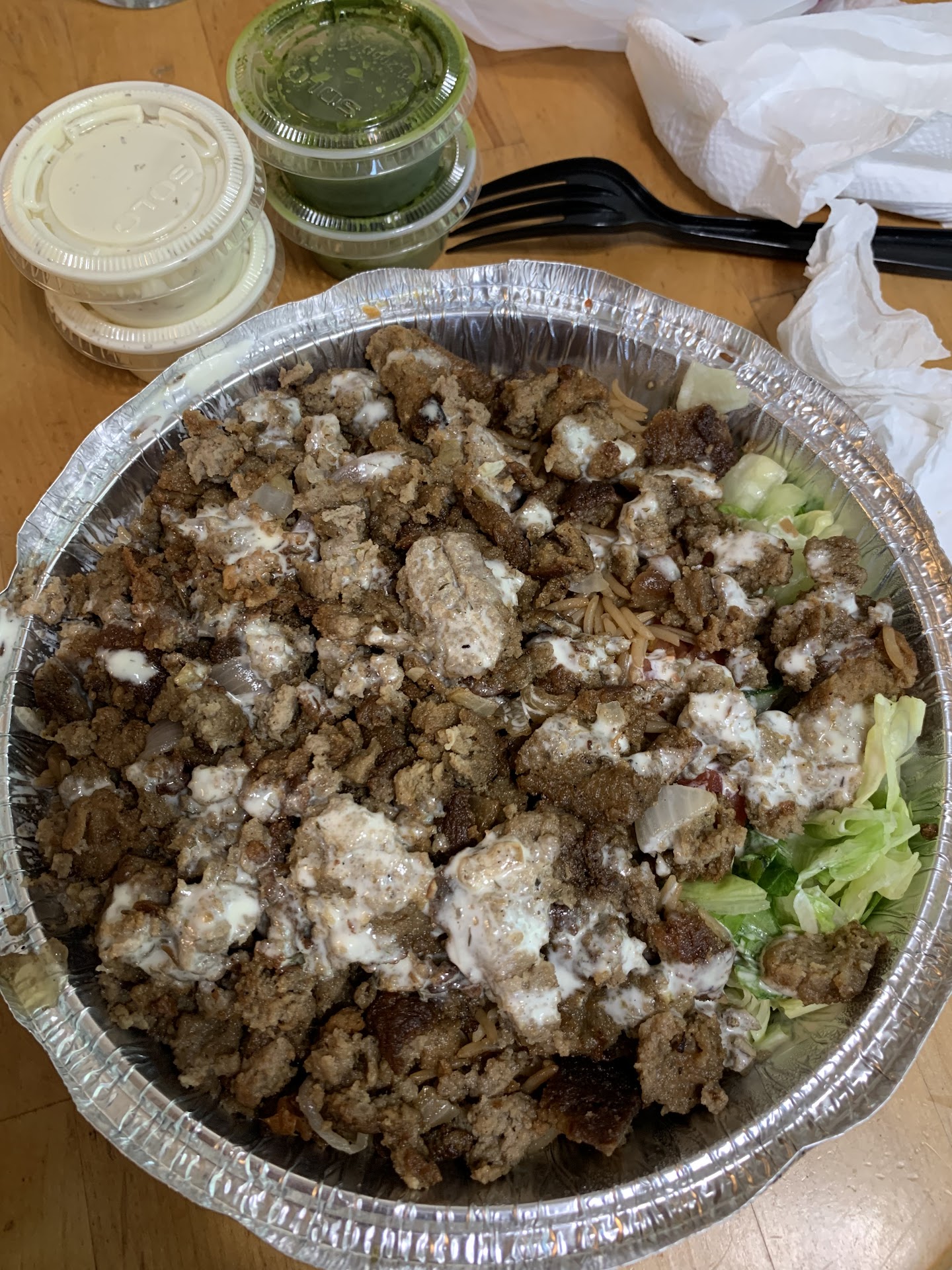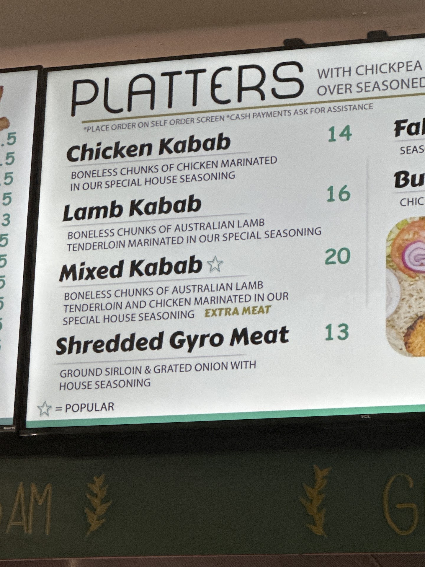 Read moreThe man working was so kind, patient, and helpful and answered all our questions as we tried to decide what to order. I do not usually leave bad reviews but this food was so bad, I feel compelled. The touchscreen for ordering was horrible, first of all, gross, you know it's not getting wiped off between guests, I witnessed that, and right before you're going to eat, yuck. Secondly, all the food options weren't listed and there were no descriptions and only a few pictures of the menu items. He had to help us order anyways, it would have been easier to just tell him what we wanted and be rung up, call me old fashioned. There was no vertical spit. Very sad. All the meats were either baked in oven or cooked on the grill, who knows when, all being kept warm in warmers and MICROWAVED before serving. The falafel is Sysco frozen falafel, or the like, with bright green food coloring insides. Updated to state that I do not think they add food coloring to the falafel bc I do not think they make it, I believe it comes like that from wherever they get it. The rice was the worst rice I've ever seen, very weird color brown, odd texture, and tasted like tap water, I did not eat it. The "salad" was tiny amount of iceberg, tomato, and red onion and the "tzatziki" was ranch dressing. The pita was ok but microwaved. The food was served in styrofoam. Bless this man for being so sweet but this was some of the worst food I've ever had to eat. I didn't take a picture because I was so grossed out and so hungry, I had to just eat what I could of it and get the hell out of there. I would never go here again. Sorry to...