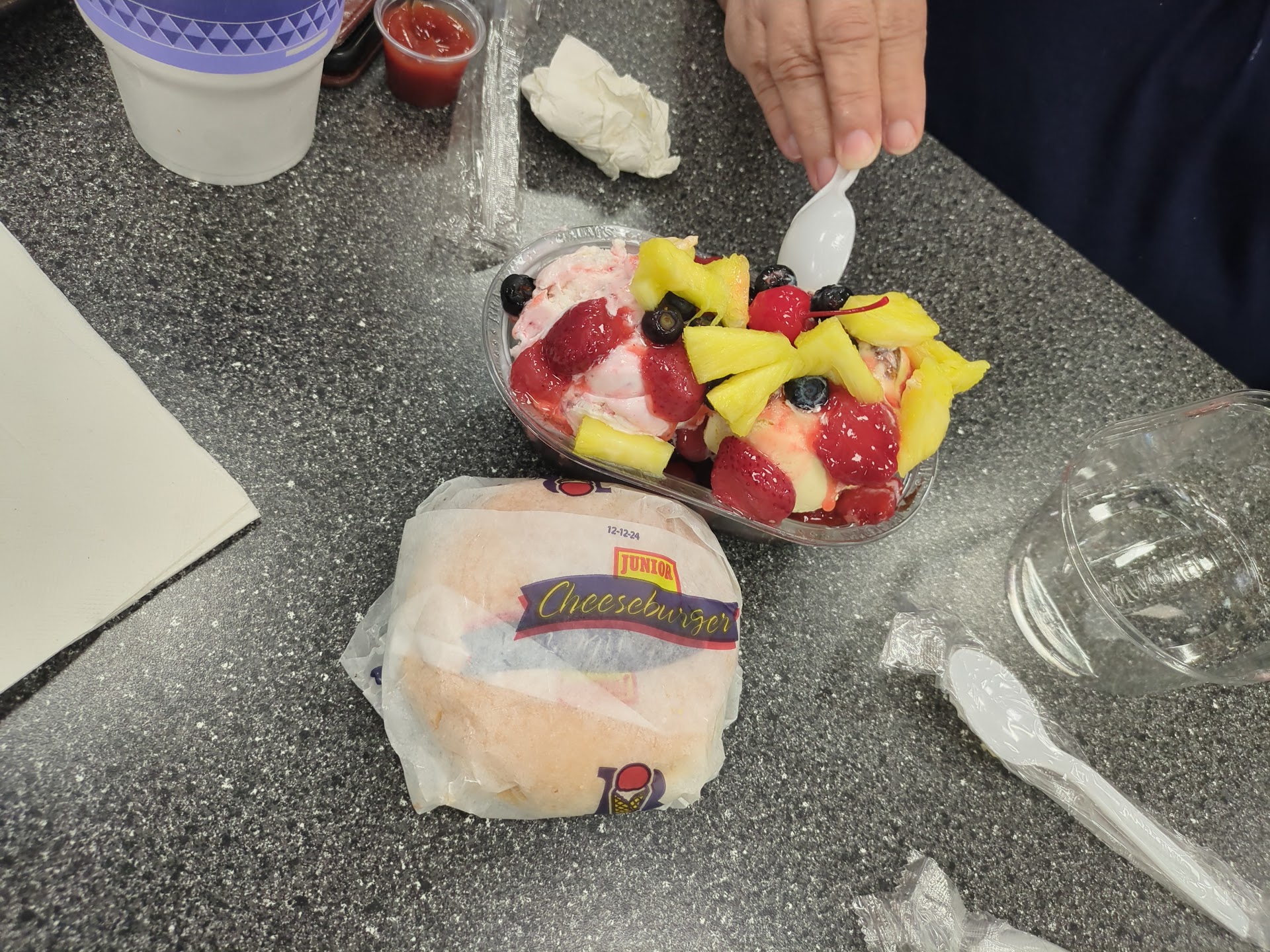 The dinning area was a absolute mess!! Dirty tables everywhere. Their was actually smeared ketchup greassy remninets of finger prints & food on tables. The fountain drink area was very dirty & gross. I went & opted to get bottle drink it was just not clean!! We had to clear off a table for the 5 of us to sit!! My boys did have their BBQ Burgers & it was good but messy. Gressy burger!! They need to have 1 person assigned to dinning area on KP DUTY always cleaning!!! One high light was a free mint chip & a chocolate & Vanilla shake. They were delish!! If you just in for Ice Cream treats or their little grocery store area it probley is consistant in those areas. Food is hit or miss!! I've been to other Brums in Kansas & they were clean & chicken foods & salad much better & fresh not wilted brown rust romaine & lettuce. Ya don't want to pay to just have to pitch order bc you fear...