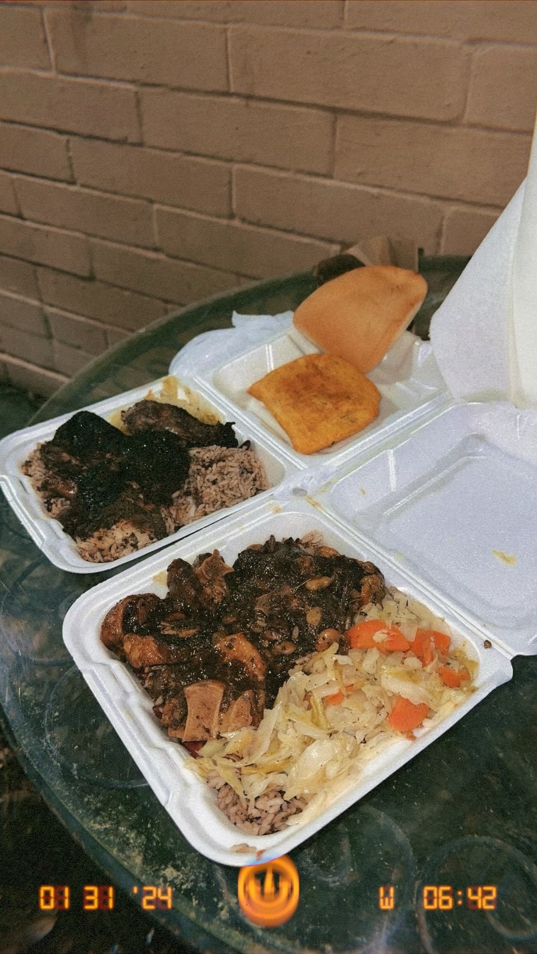 Read moreWe went for lunch and the line was understandably getting long. There seemed to be only one person cooking in the back, one person at the register and one person starting orders with those food items that are made in advance. The owner was present and behind the counter, however, unfortunately he was motivated to assist his employees in moving the line along and getting patrons their food any faster, he just seemed to be interested in chatting with customers, and while public relations is key, lets not do so as to run counter with patrons getting their orders filled, which is already in competition with the volume of take out orders. Please note, this is a counter service only establishment. I do wish Yelp would add this feature to their app/site, I think that users would find it helpful. If you prefer table service for nearly $50 (price for using a credit card, which was not indicated with cash prices on the menu, just that those advertised are cash prices) for two meals, then I'd suggest you keep scrolling. I really am a proponent of mom and pops, but it gets harder for all involved with this choice of pricing structure. Also, provided an establishment makes the user aware of this in advance, you could either choose elsewhere or go to the ATM. Another feature I think Yelp should consider given so many restaurants are shifting to this pricing structure. As for the ambiance, save for the homage to Bob Marley, I would say there isn't any, and that's ok. Most importantly it was clean and orderly. I got the oxtail, which was divine in flavor and fall off the bone tender, but it was without question the smallest size oxtail I have ever seen or ordered... perhaps they were severely malnourished....over rice, pigeon peas and kidney beans which were fabulous. However the cabbage was seriously lacking in flavor and amount, there was no more than 2 heaping tablespoons in the portion. The spinach patties was unique and although it seemed like it was sitting in the warmer for awhile, the interior was delicious. When asked by the owner for feedback, I regret not being transparent, however, I truly thought he'd look at me and say "what would you know?".. I spent a number of years during and after college in NYC and I ate my way through a lot of incredible ethnic food which Jamaican occupied many of those calories. My husband got the jerk chicken, same sides and the mild beef pattie (out of spicy). He stated chicken was spicy enough, cabbage was tiny and lacking in any discernable flavor and he didn't care for the same rice and bean mix ... to each their own. I thought it hit the spot. Portions of rice were generous, not of the meat, so at least there's that for leftovers. I really want them to succeed, but I can't justify going back at this juncture based on price vs. portion of actual protein... but you be your own,...