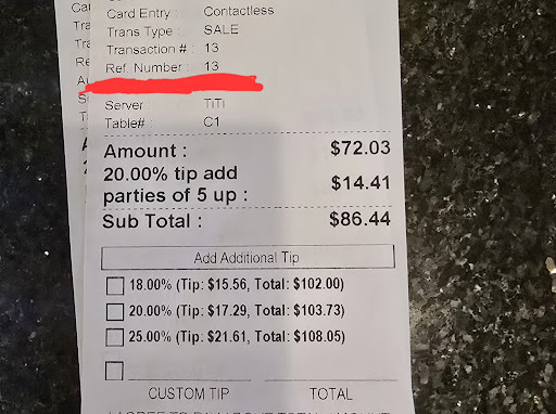Read moreI ate dinner here a few weeks ago and the dinner itself, the atmosphere, and the servers, were lovely. However, when my dining partner paid the tab, I paid the tip on my debit card, and the receipt they brought me to sign was confusing--unclear whether they had already charged the tip to my card. The server who brought the receipt did not explain anything either. So I wrote in the desired tip amount on the receipt and signed the receipt. A few days later my bank account showed I had been charged twice for the tip. I called to ask for a partial refund, and was told by a guy who sounded reluctant to help that a manager would call me back within the week. A week went by, no call from the manager. I called again and was told by the same reluctant guy that I need to call back on Tuesday at 11am. Since I am a flight attendant and got sent on a trip on Tuesday at 11am I was unable to call, so I called a couple more times, in the morning when nobody answered and in the evening. Got the reluctant guy again on an evening he said was too busy and the manager was unavailable. I told him I understood nobody could handle the situation right then but could I please receive a call back from the manager when the manager is available. He tried to tell me three times that the manager is not available right now, and I asked three times for a call-back when the manager is available. Finally he understood my request which presumably would require simply writing my name and number on a post-it note, but instead he put me on hold for ten minutes. When it became unclear if he would ever come back, I hung up and called back, and thankfully got voicemail. Left a voicemail requesting a call back from a manager. That was four days ago no call back. I called again today and received the same reluctant guy who finally wrote down my name and number. He informed me I need to have a paper copy of my receipt in order to receive a partial refund. Who saves restaurant receipts? The restaurant has my receipt, signed, no?? I will be contacting my bank to stop the entire payment. I was generous with my tip because I work in customer service and even tho I probably make less money than the servers I believe in treating people fairly. Now that I have had this much trouble I don't ever want to go back to this restaurant and will not be recommending it to my flight attendant colleagues even tho it is located closest to the...