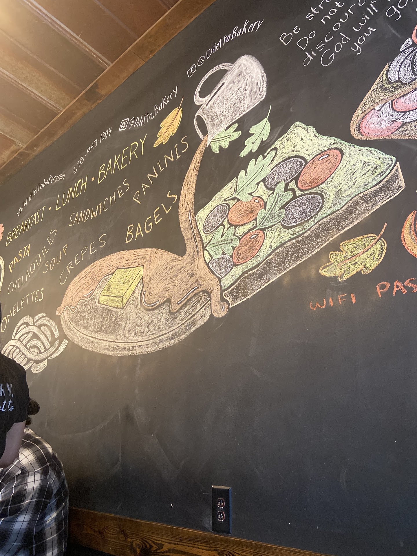 Read moreMy husband and I decided to stop in a visit Diletto bakery on Saturday morning a little past 11am. The location is really good for the up and coming area of Gainesville. The parking lot is a little lacking and confusing, still not that big of a deal. The auto parts store is next door so I was able to pick up some wiper blades too so that was convenient. Anyway, when we walked in we were greeted by a very nice hostess and told the wait would only be a few minutes and she let us know to wait in a little seating area. While we were waiting I had a good chance to take in the vibe of the place. It was a cute modern-industrial rustic style, very âfarmhouse meets cityâ which I feel is very much like Gainesville. There was a very cute chalkboard mural which I loved looking at. Once we were seated someone quickly asked if we would like some water, it took a few minutes for her to come back but not long, but she left again because she was very busy and could not get our order yet. The restaurant was very busy there were people at every table, people picking up to-go orders and coming in and out. The sound kind of bounced around the building (I am a little adhd so lots of noises like that really do overwhelm my senses but itâs something most people donât seem really notice) causing me some anxiety but the open layout and good natural light helped with that feeling. A bit later another server came out and took our orders. I got the avocado toast with seasoned potatoes and a caramel macchiato with almond milk, and my husband ordered the steak omelette with seasoned potatoes and a regular coffee. The bread was just absolutely perfect and the avocado tasted very fresh. The avocado toast came with cherry tomatoes halves and mozzarella cheese and I added a fried egg. The seasoned potatoes were delicious and came with a wonderful dill white sauce to dip them in which was a perfect combination. They were very well roasted and the skin texture of the potatoes was just what you want with seasoned potatoes. I did not try my husbandâs omelette but he enjoyed it and easily ate the whole thing. I loved mine but the coffee I had and all of the potatoes and bread, I definitely bit off a little more than I could chew. I will have to go back to try some of the other menu items because so many of them looked amazing. They desserts and pastries looked really...