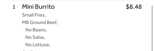 I ordered food for my three kids and my spouse. My spouse’s food was excellent, and my daughter’s quesadilla and fries were amazing. However, the kids' burritos—now priced at $8.48 each (screenshot attached)—were disappointing. When I brought the food home and opened it, the kids' burritos were half the size they normally are.
