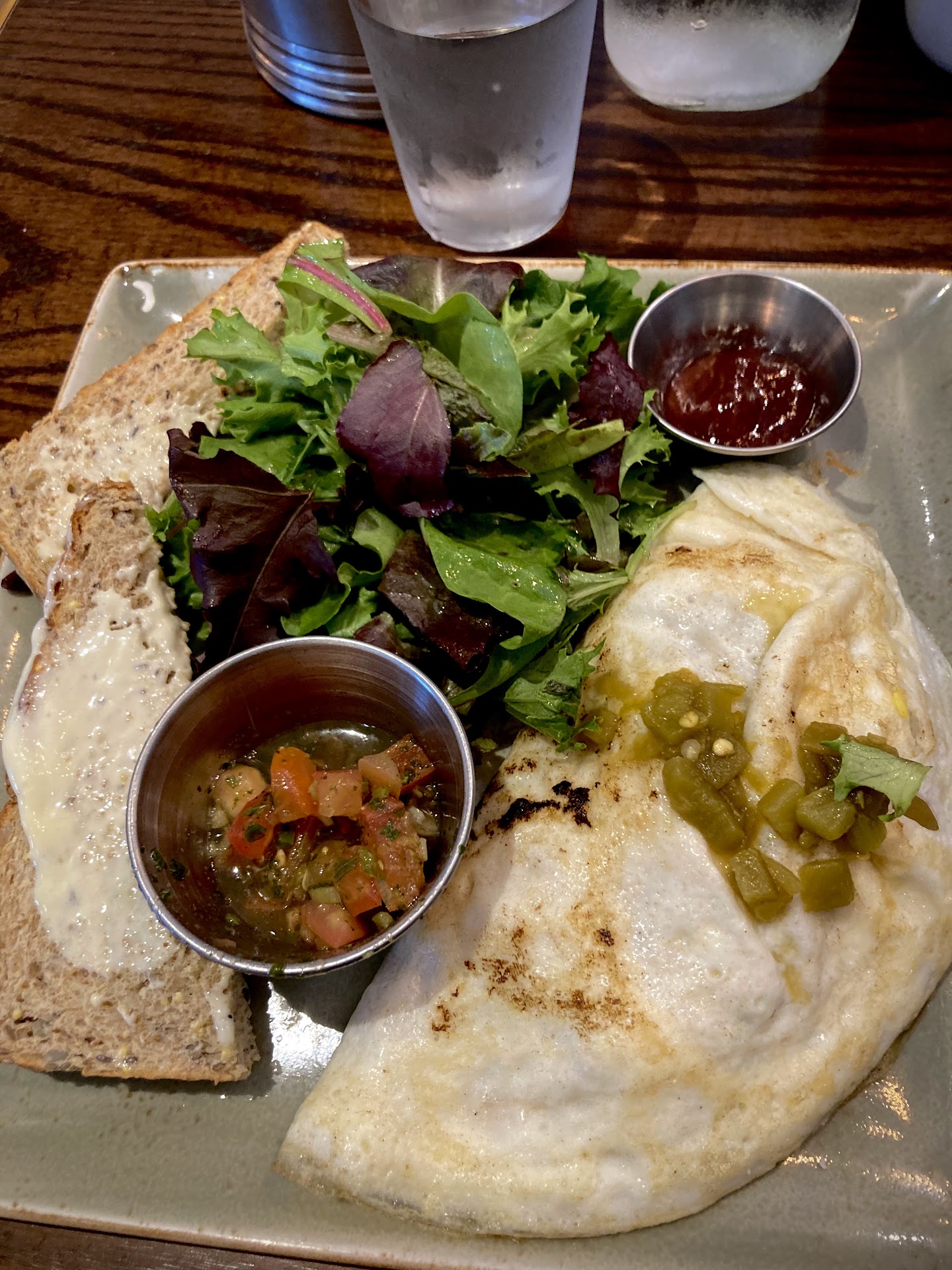 My husband had the farmhouse hash, a heaping bowl of potatoes with herbs, avocado, bacon, tomato, onions and cheese and topped with two eggs any style. It was bright and fresh and so filling. It came with some really delicious multigrain toast and jam.