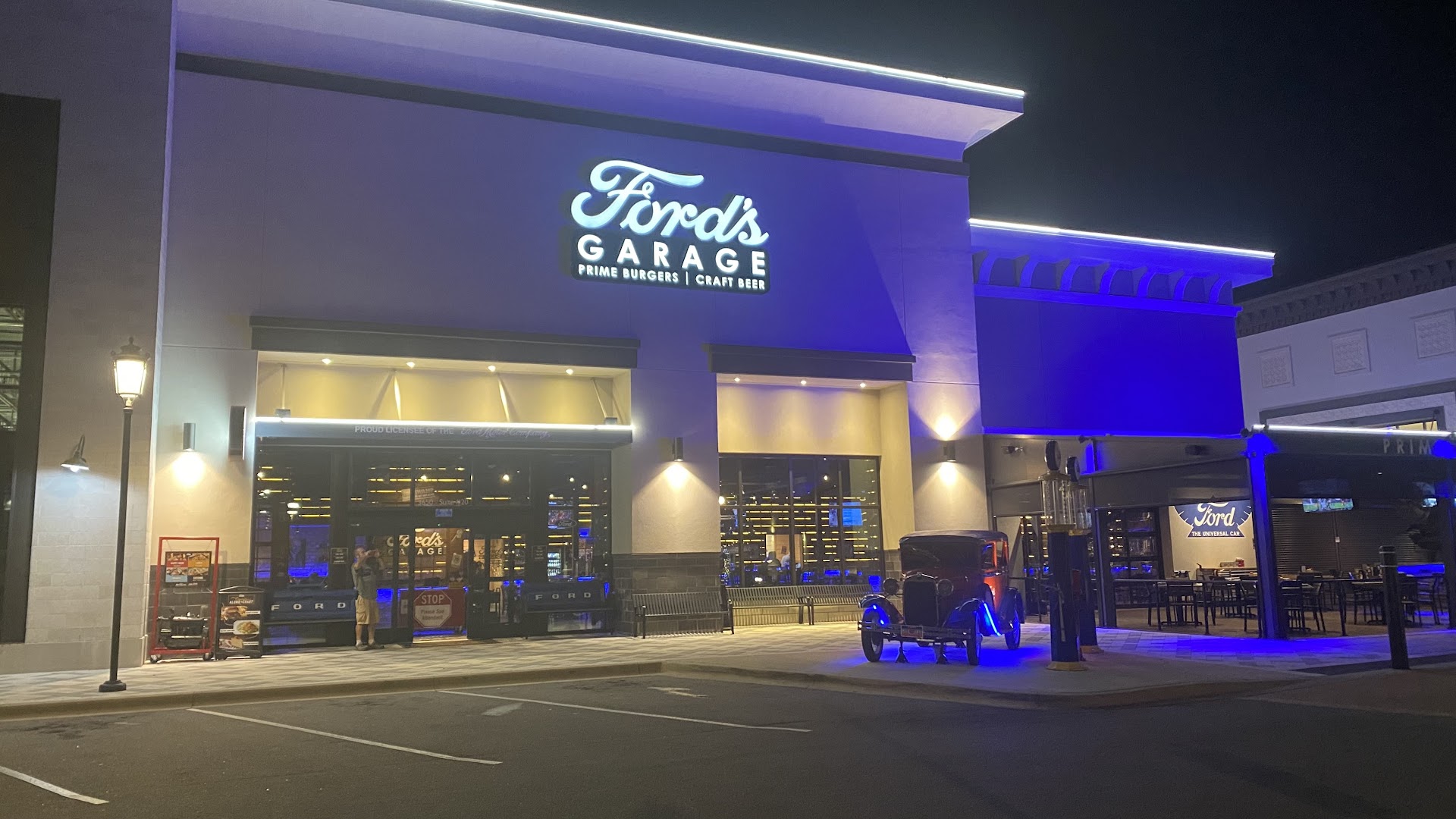 There was what must’ve been a model T Ford outside with cool paint applied to it. The main sign on building is very showy and well done. Easy to spot when hunting this spot down. Blue and purple lights adorn the dining area and large, factory appearance fans move the air around from above. Engine blocks sit atop a long table area and there is so much options for seating. Outside cafe-type tables. Bar area, booths, large corner booths, plenty of tables and chairs. An impressive gift area by the door for souvenirs. Even the tables are stamped ‘officially licensed ford products’. Nice touch!