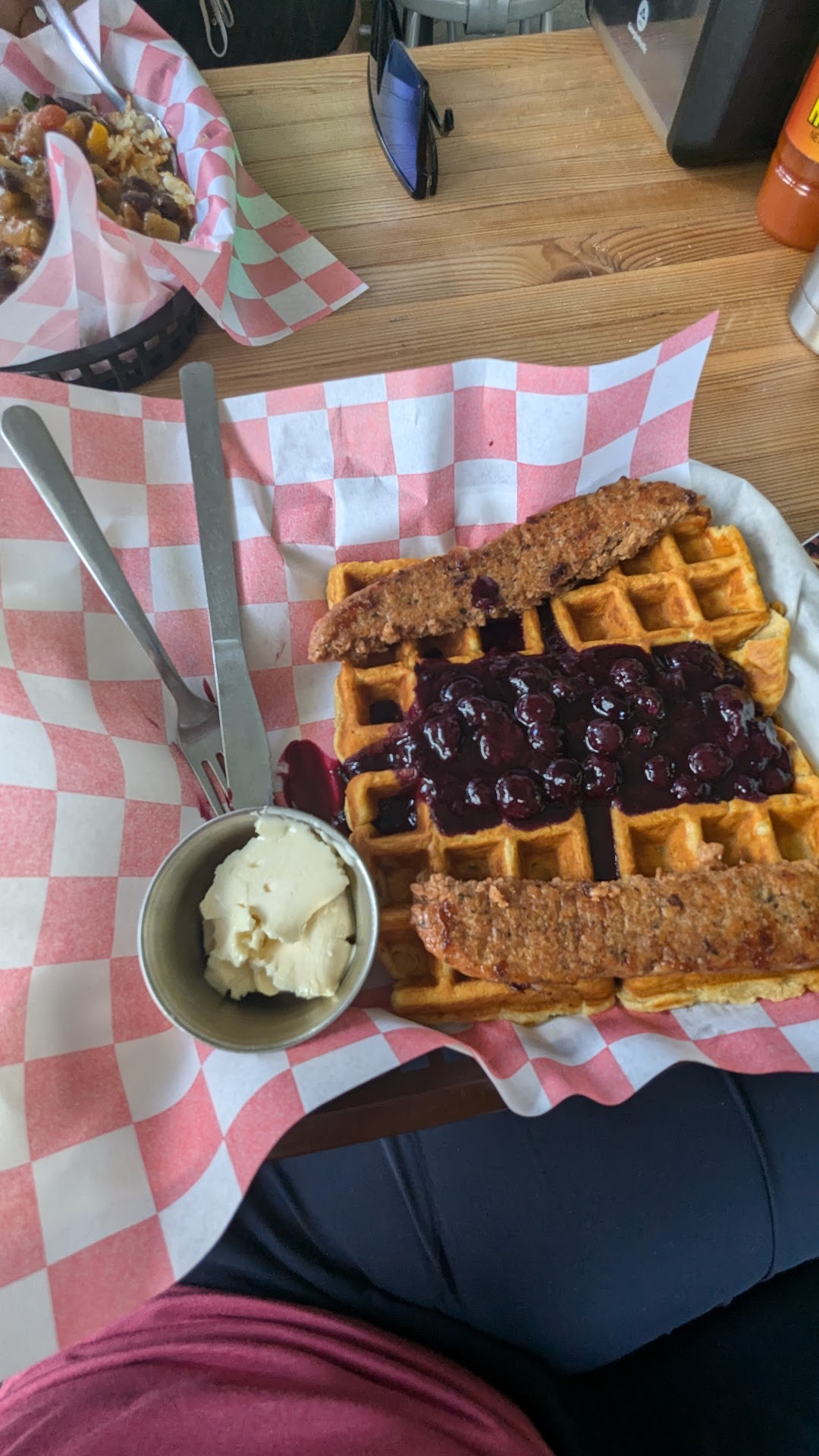 Ā Ā Ā Read moreAs I sit here, waiting for my food, I can only say great things about this place. Inside this small, high energy, gold mine, you feel like you are outside in the streets of France, which the exception that everyone speaks very clear English. Keep in mind, I've never been to France. I've already had great interactions with the two positive guys, who from what I can tell, really enjoy being here. They are kind, social, and funny. They hooked me up with a cup of steaming ice cold coffee and milk (they only have non-dairy š). We showed interest in their stickers and they justed handed us a sheet of them. Very kind and giving. Op the food just arrived! There house made eegz and hamn is damn good!! Waffles are top drawer. I really like these guys, their company, and what they represent....