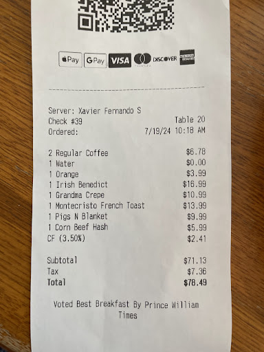Read moreThis is my first and last time I’ll be eating here. Not only did we wait an hour for our food to be ready, it was also not even fully prepared. We all ordered the same special, and it was breakfast; the easiest and fastest to cook. It came out in waves even after the long wait, and the server was not friendly at all. She didn’t care about maintaining her tables clean nor did she have any sort of respect for her guests. Not once did she apologize to our table about her being the only server, having one cook, and having to wait for a long time. She didn’t even come to our table to ask if we needed refills on water or drinks. She kept making excuses. This was only the server. The food itself tasted like it was cardboard from a can. It lacked any flavor, and it was poorly made. To give you an example: the French toast was just a piece of bread that was grilled and had excessive cinnamon sprinkled on one spot. If you don’t know how French toast is properly made, just know that this is not the way to do it. It was served cold, and one of our party members noticed that the food was being left out for at least 10 minutes; waiting for the server to deliver the food to the table.