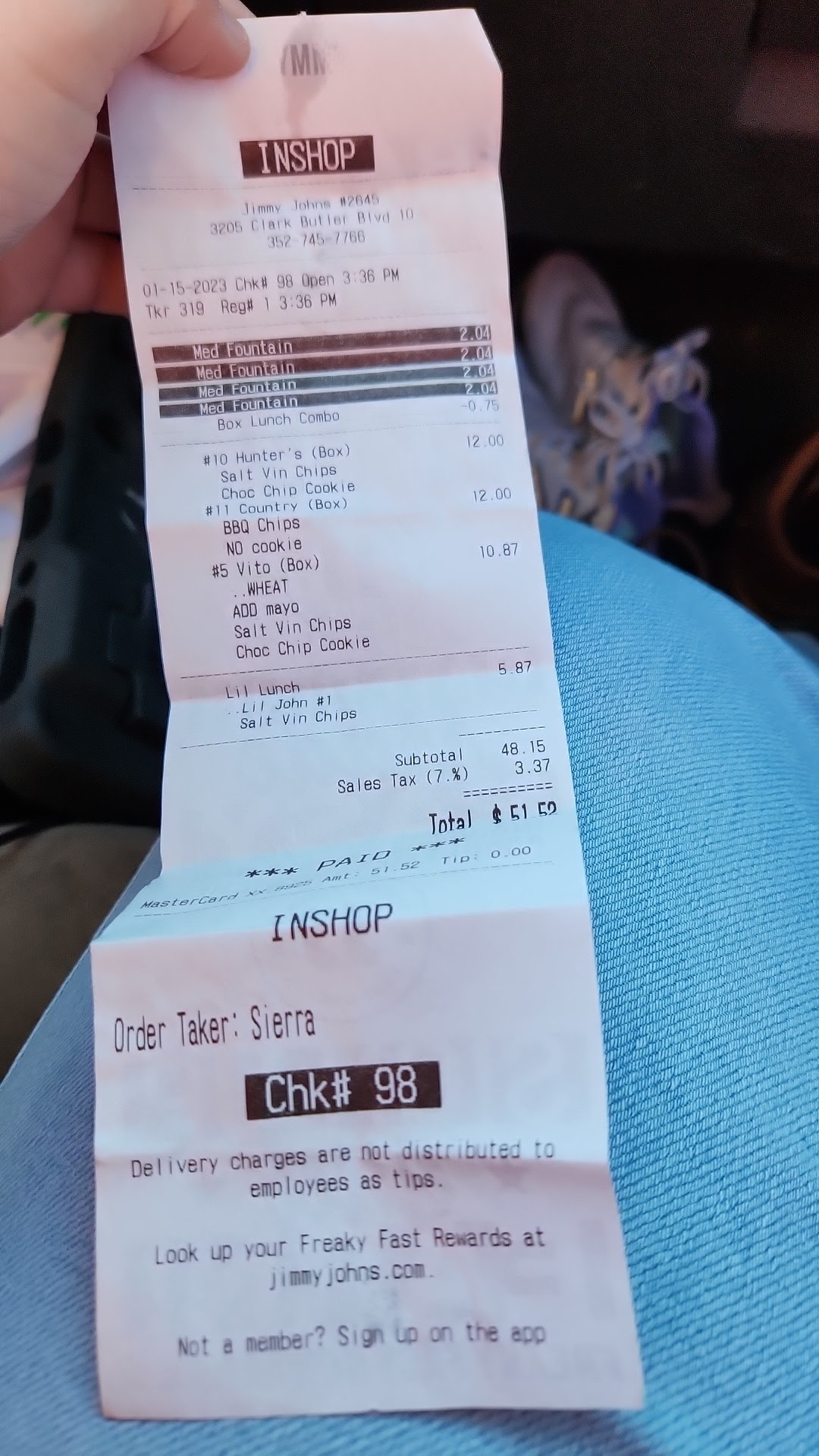 I had placed a mobile order on February 3, one of many that we usually do. I work at the VA Medical Center and Jimmy Johns is a staple in my unitâs lunchtime plans. During one of my commutes home, my wife asked that I pick up some dinner from your 3205 Clark Butler Blvd. Unit 10 location. While the service was relatively slow and wasnât ready despite it being placed 20-30 minutes prior. That was not an issue, considering I work at the hospital, I understand the current COVID situation and how it affects staffing.