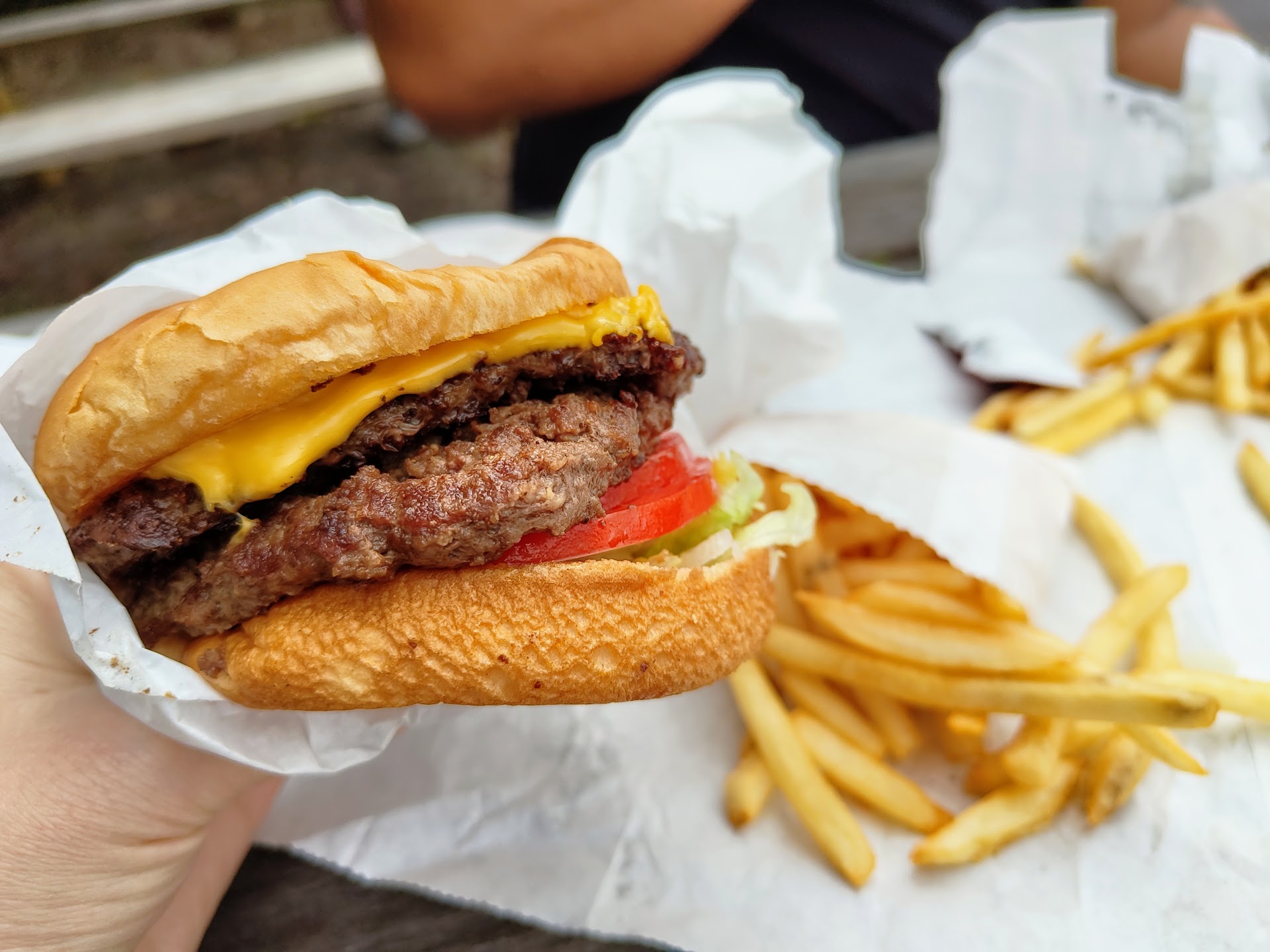 Burger: The burger is a perfect size for lunch. It's not so big that you are going into a food coma in the middle of the day, but not so small that you feel like you won't make it to dinner. As others have said elsewhere, the burger is a good amount of greasy. It's not so greasy that it busts through the bottom of the bag, but not so dry that you have to wash it down with water (both of which I have had before). I had my burger "All the way" which has all the fixings; lettuce, tomato, onion, pickles, mayo, etc. and there was no excess lettuce water or veggie liquids saturating the burger, which is great. The meat is flame grilled. It had a nice crust and was done throughout, there was no pink, just grey. Do not expect a juicy burger nor a charred burger. It's right in the middle. The meat tastes like unseasoned ground beef. This makes the burger unoffensive and pallet-able to all. I had ordered the double burger (no cheese or bacon). Adding a couple of strips of bacon may resolve the primary issue I have of the blandness.