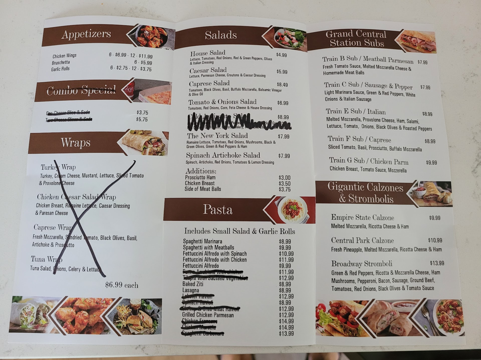 We live super close and love to support local businesses so we drove over. There's no dining room, so no big deal, we'll get it to go. The 2 person staff was in disarray. We get our 2 pasta dishes and the Alfredo sauce is so runny that it escapes the container and runs out onto the car seat and my clothes. Not terribly though so the guy at the counter gives me some paper towels to clean it up and apologizes. We also realized they failed to give us the included salads and garlic knots. So, we ask for them and after a few minutes we took it all home. The spinach fettuccine Alfredo was like a soup with 5 quater size pieces of spinach. The "baked" ziti was noodles in a cheese marinara sauce and far from baked. The garlic knots, while edible, were chewy and tough. The salad was acceptable. We won't be going back to try their pizza, in fact, based on my broef view of their operation I can't imagine they will be in business much longer if they depend on return customers. This is a picture of their menu with their sharpie...