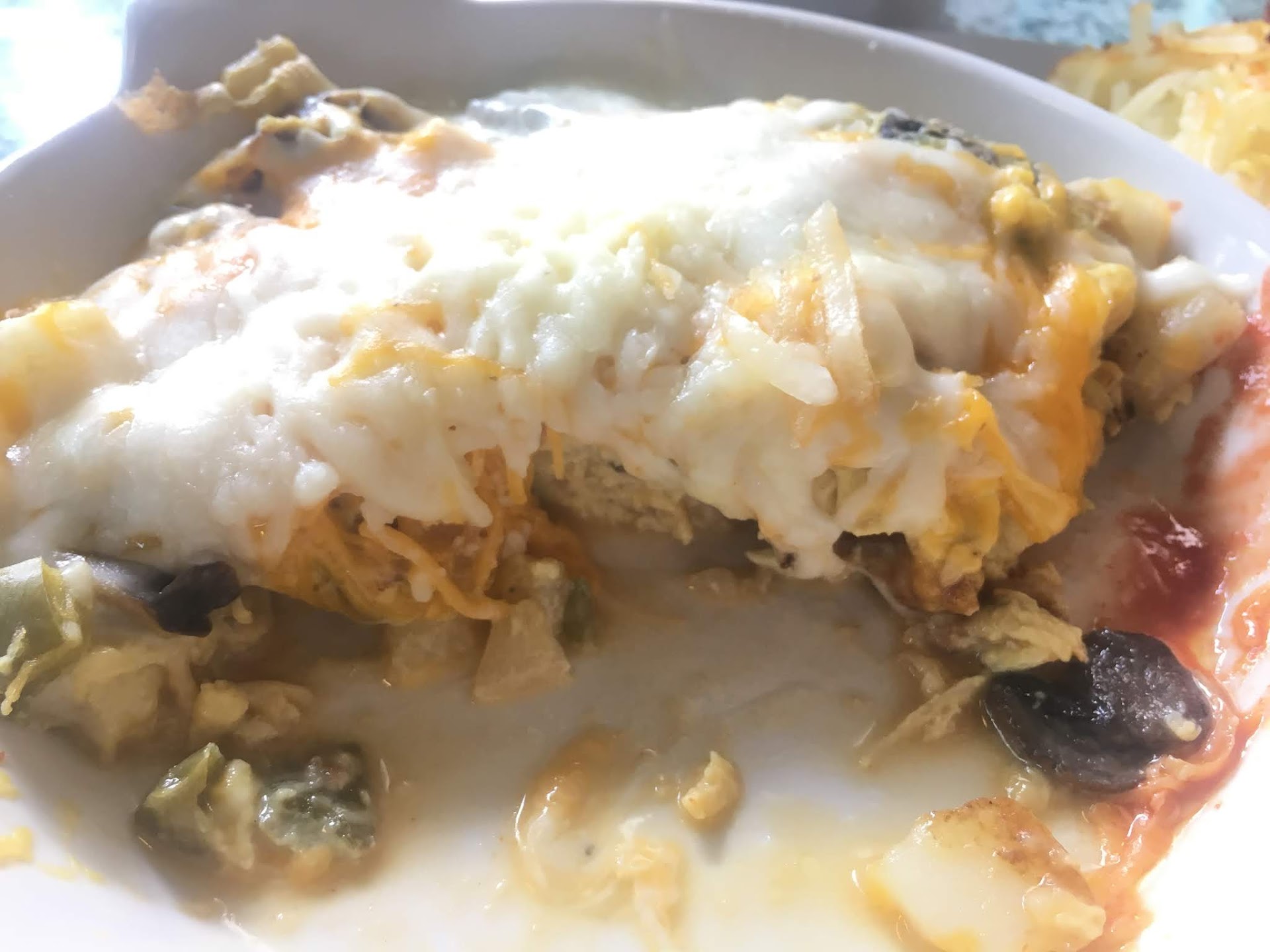 The dish was on their breakfast favorites menu, described as breakfast pie with layers of egg, onion, green peppers, cheese, and potato. In reality it was appeared like an open-face breakfast burrito that had been topped with an enormous handful of pre-shredded cheese and microwaved. The scrambled eggs were off-color and soggy. The green peppers were grey-green mush. Potatoes and onions were also overdone. The only good ingredient was mushroom. Besides looking unappealing, the dish had no redeeming flavors, far too much cheese, and was SO WATERY! The only reason I know of for a breakfast dish to be that soggy is if it was frozen and reheated, probably by microwave.