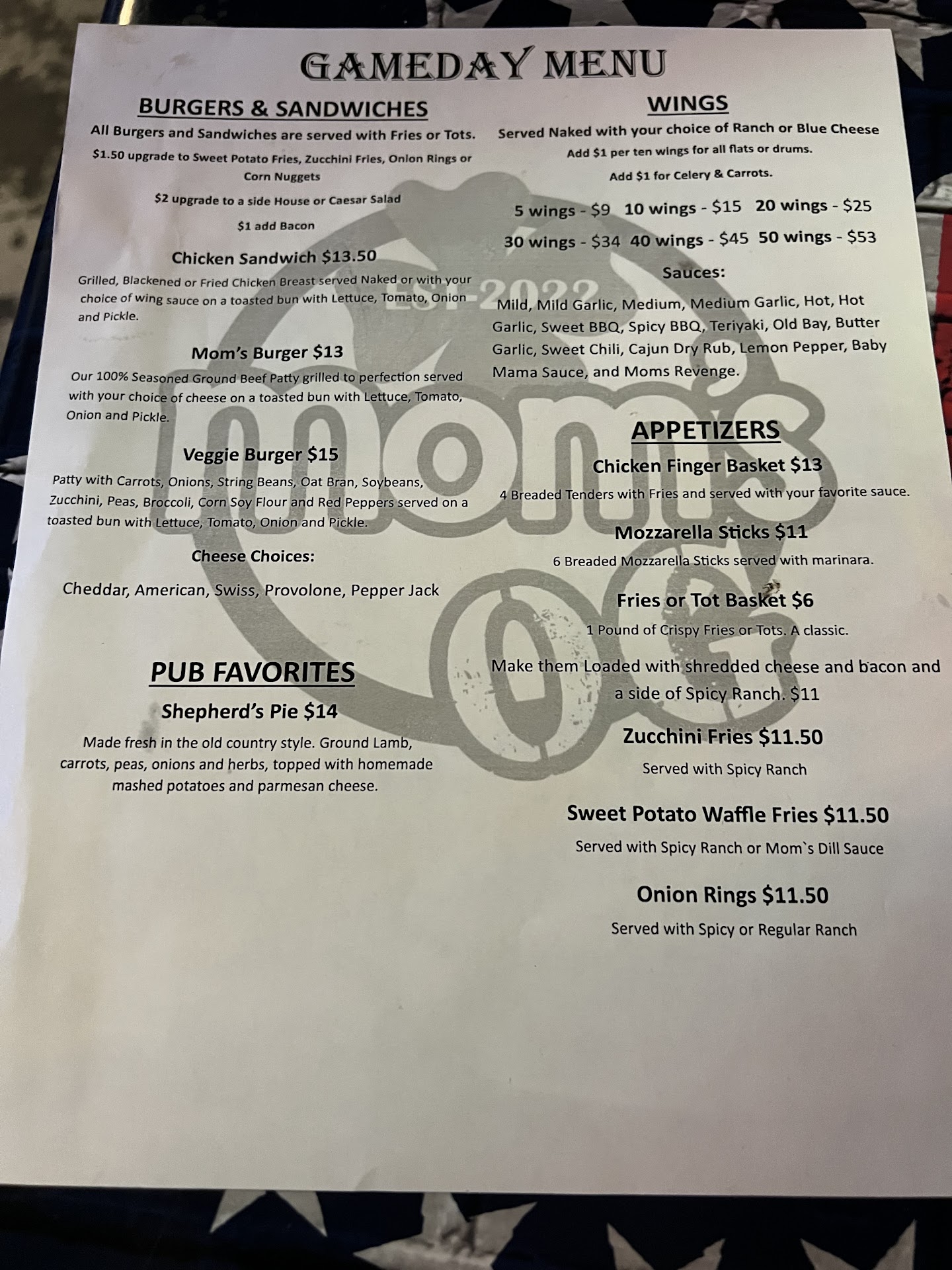 Read moreI went with my son to Mom's OG, after we unloaded the car to move him into his dorm room. Burgers were good unfortunately we were there. Same time that our server was eating lunch, but he did a decent job. They didn't have any unsweet tea available, which was OK? The whole place was pretty smoky from the kitchen all the way forward, like the exhaust hoods aren't working properly. They had fans in the dining room to keep everybody cool but my opinion would be to use one of the fans as an extra exhaust to get rid of the smoke. Other than that very cool atmosphere if you like dive bars, I...