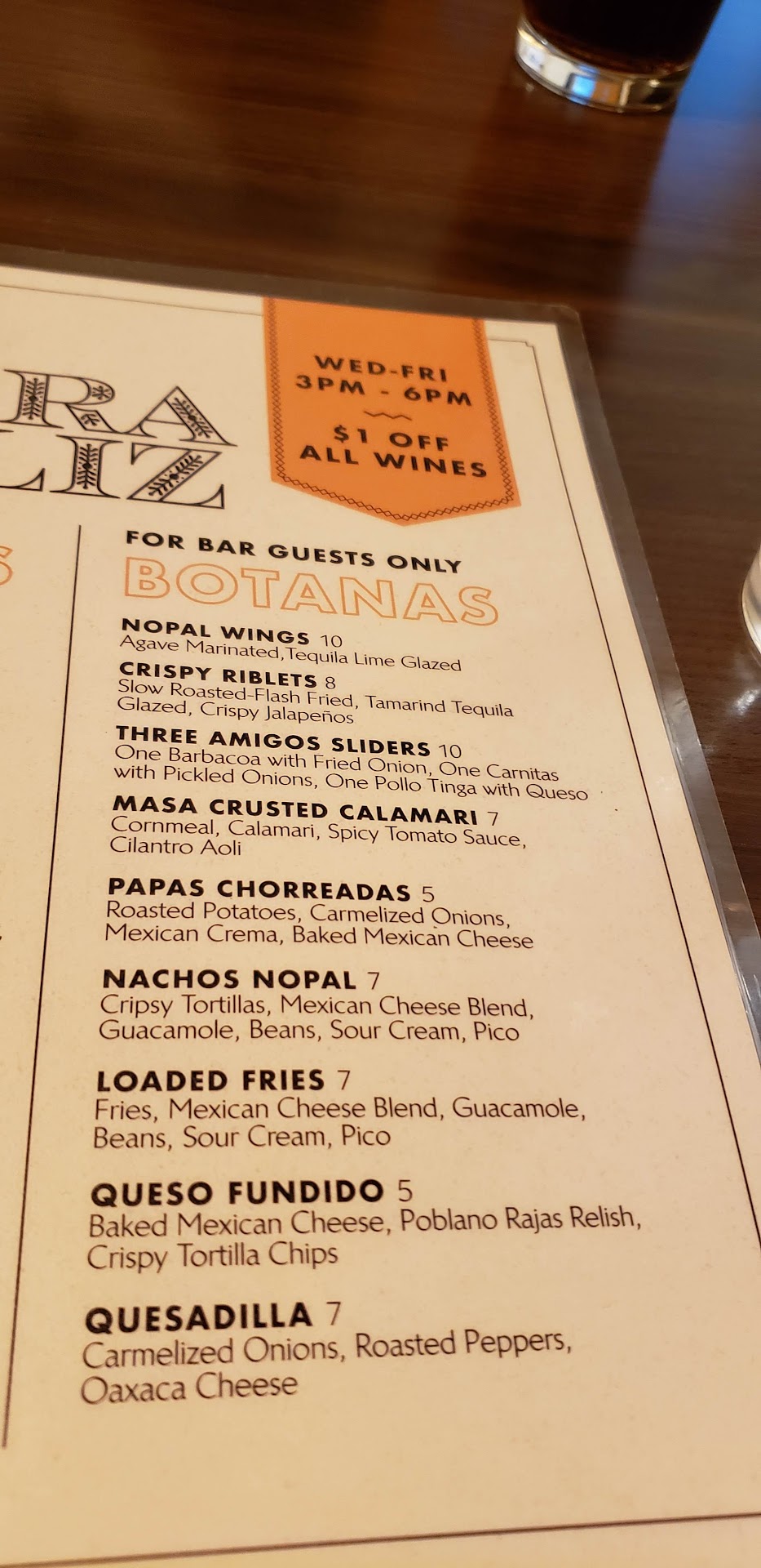 The lunch last week lunch was a plate of nachos as an entree (delicious!!!!), pork belly tacos, and 2 margaritas ($4 special). This lunch was $38 plus tip. The food both times was flavorful, hot and delicious. They run lunch specials on cetain days, so be sure to ask about the lunch special.