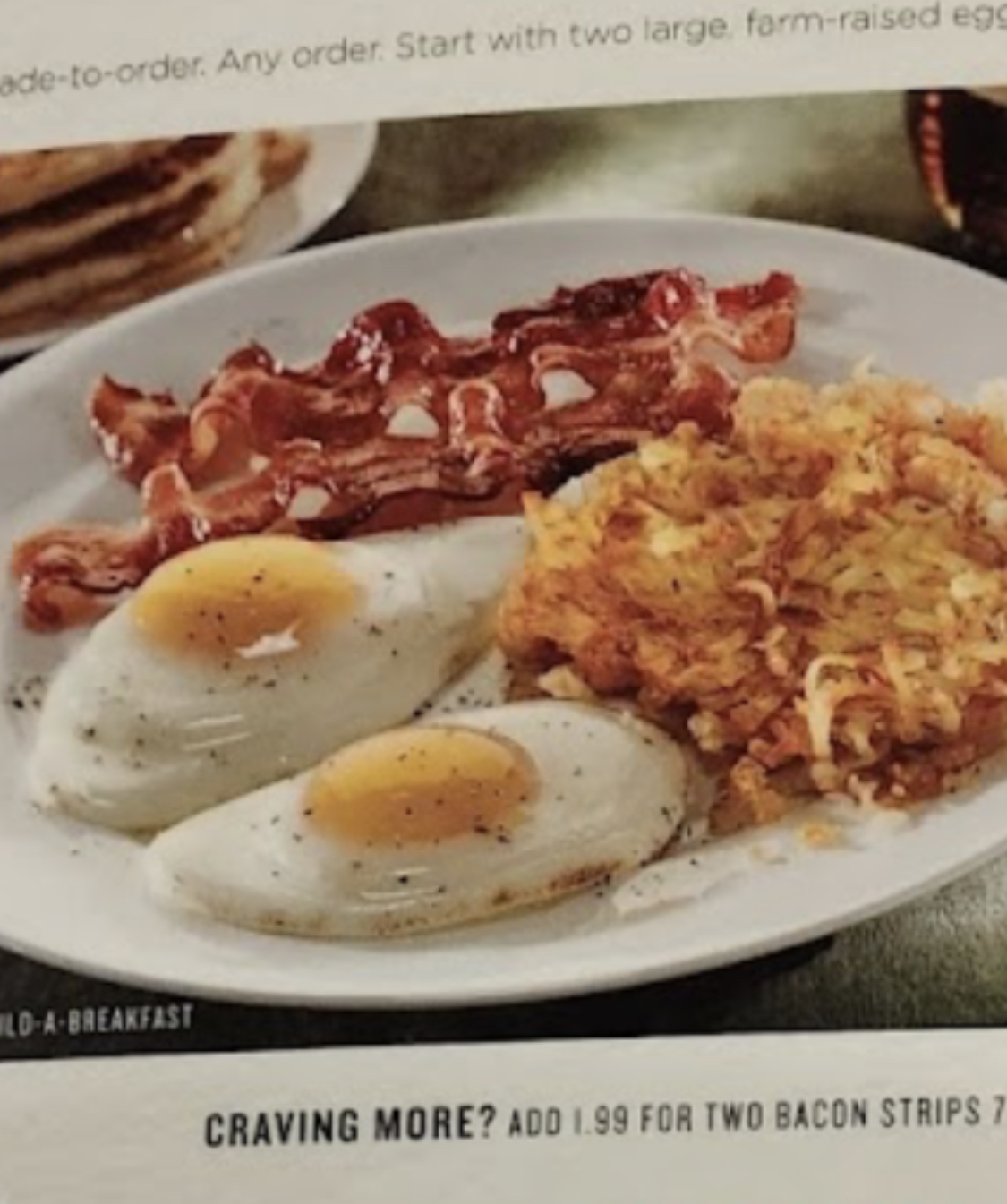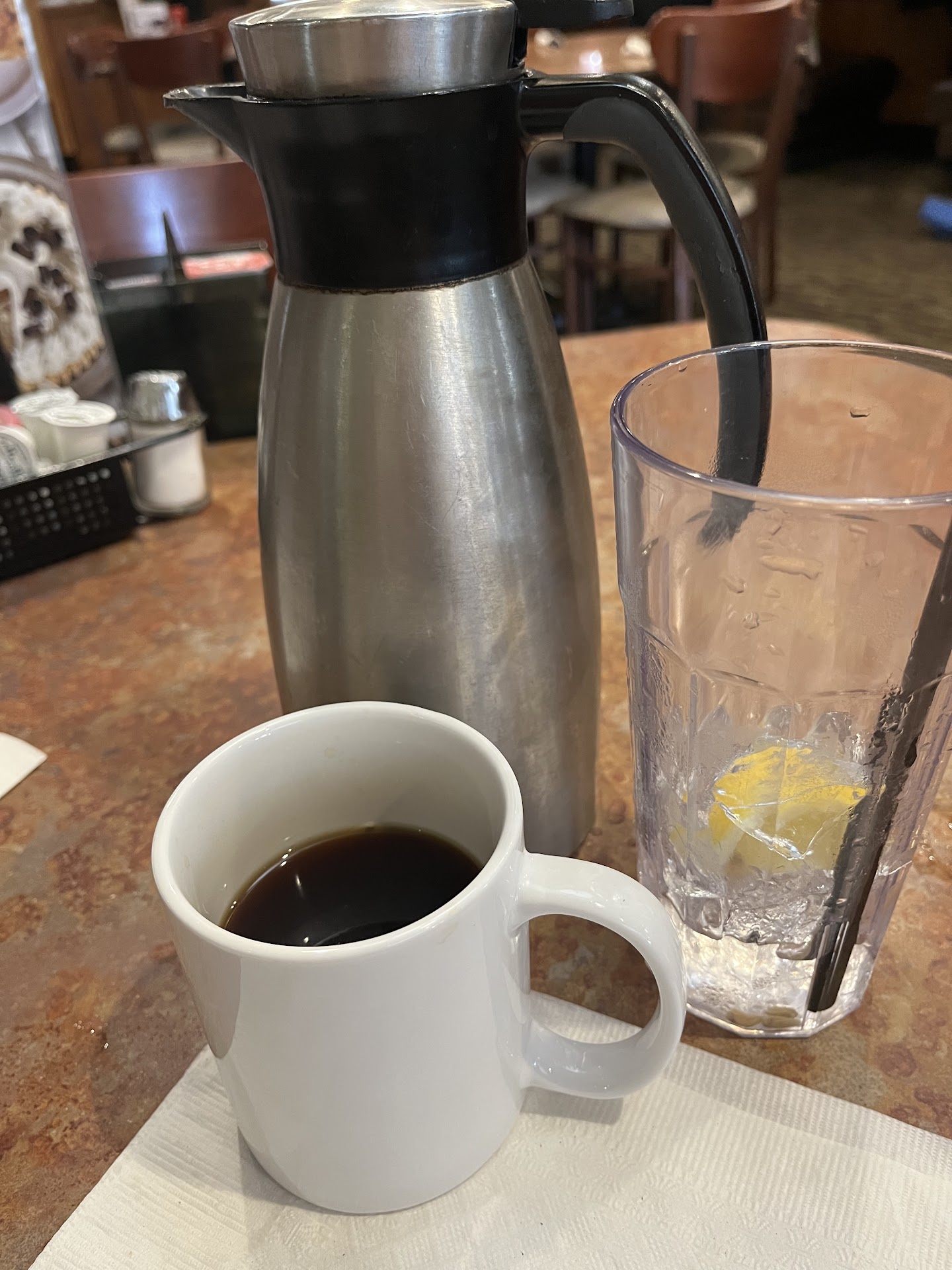 Food: The wife had their breakfast special, 2 eggs (over medium), 2 strips of bacon and 2-3 pancakes, with water. The wife reported nothing exiting about her breakfast. (For the record, the wife is an excellent cook, if she says nothing is exciting, there was nothing else to say.)