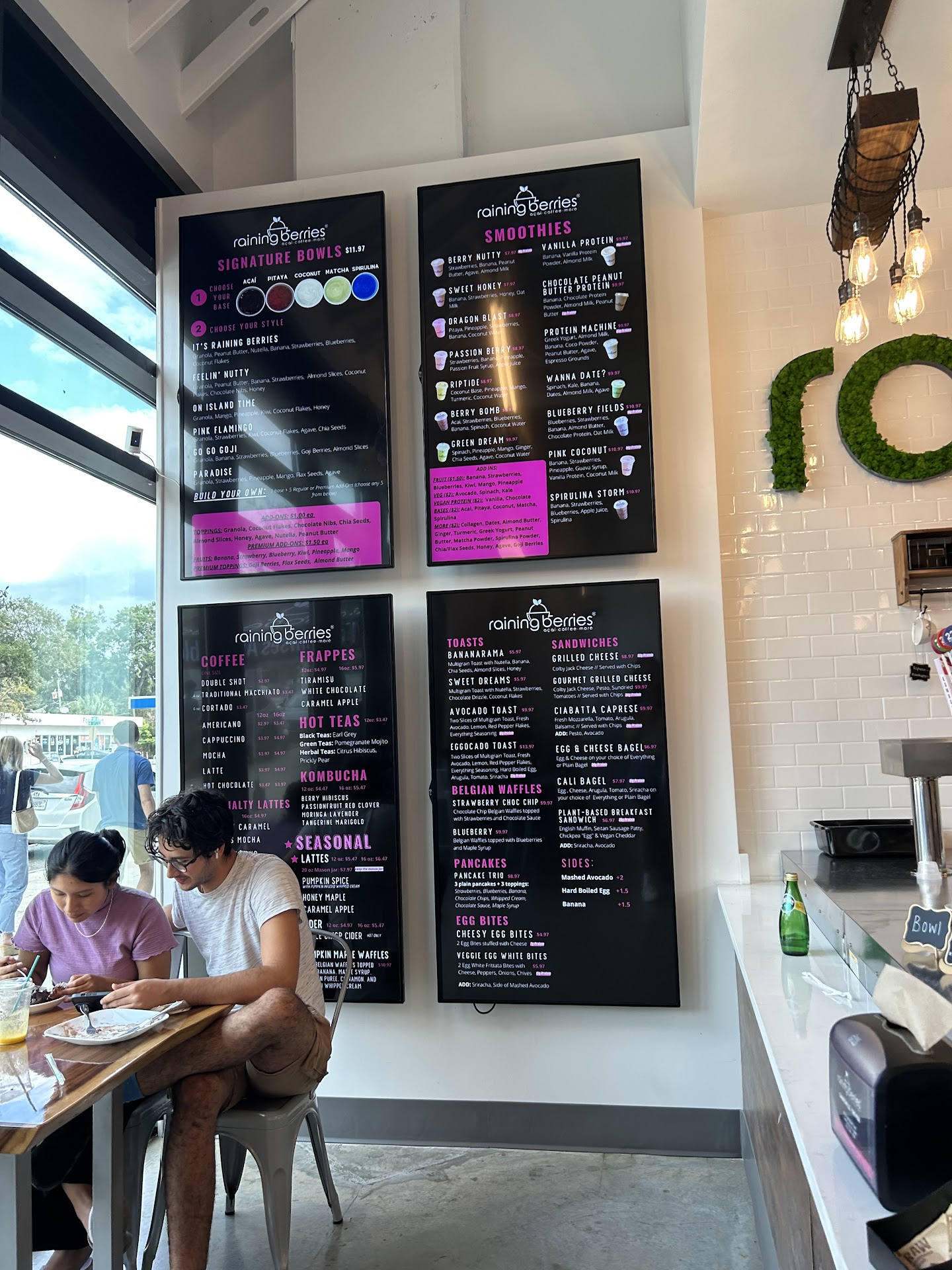 We stumbled upon Raining Berries as we walked down University as it's located at the base of a lease condo complex. We went in for our usual Lattes and Café Mochas which were Good and I had the three pancakes with fruits. The pancakes 🥞 were Not as fluffy or as large as one might think But the three topping choice they give you makes up for it, I had the strawberries, blueberries, and banana 🍌 toppings which were Fresh. Next day we returned, and the place was much busier than day prior. My son, ordered the egg 🥚 and cheese 🧀 bagel 🥯, and my wife and I the Avocado 🥑 toast. All our food was tasty and arrived by name call out whenever a dish was ready, so not ALL at the same time, which is fine. What could have been better was the service time ⏲️, our food took a VERY long time to be served, and though the place was busy it wasn't overwhelmingly so. Either way we were in No rush so it was Okay. They also offer smoothies, with or without proteins and the serving sizes are comparable to other coffee shops. In fact, their 20oz comes in a mason jar, which you get to keep. The place itself is Big, VERY Clean, and VERY Welcoming. Most of the tables have built in charging ports for phones, laptops 💻 and such. There is also an enclosed study room to really have your quiet time, meeting, coffee ☕️ and/or food. Overall, I Really recommend Raining Berries for Gainseville student needs or...