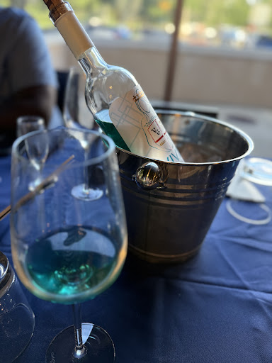 Stepping through the doors, you instantly leave the everyday hustle behind. The location, thoughtfully situated off Tower Road, feels like a fortunate discovery—an escape without the downtown traffic or fuss. Inside, the design is a sensory delight: the rich, organic texture of the cork filled live-edge bar top and the striking artistry of the painted walls set an elegant, yet approachable, tone. The space is intimate, featuring cozy tables and plush booths, all anchored by the truly magnificent bar. The deep, sapphire-blue chairs add a regal flair, making you feel less like a patron and more like an honored guest. Your eyes are naturally drawn to the brilliant wall display behind the bar, a curated masterpiece of wines that promises adventure with every bottle.