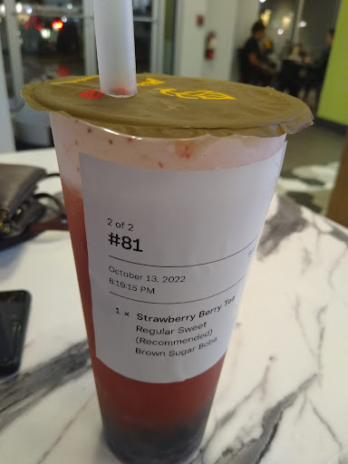 The bubble tea is delicious! Personally find the regular sugar to be just right here, not overly sweet. One thing I love is the ice, they use the small chip pieces so most of your drink is actually drink, not ice! The cups are also made of the nice hard plastic. And the straws are very durable too! Weird things but they stand out to me.