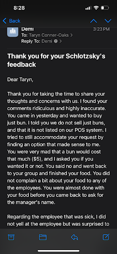 When I first arrived the cashier was lovely and helpful with helping me decide on what to get. When I decided on the pick 2 baked potato soup and Mac and cheese. When I got my food I then decided I wanted to get a toasted bread bun only just the bread.so I went up to the counter and I asked the cashier that helped me earlier and they couldnât find a button so they went to grab the manager Demi, this manager was rude and very unwelcoming when he got to the register,mind you it wasnât busy nobody was here besides me and one other family that was already eating their food he immediately asked the cashier âWHATS THE PROBLEM?!â In a very rude and passive aggressive tone and when the cashier explained what the issue was (they couldnât find a button for just the bun) he said ok and for the next 15min I kid you not he was searching on how to charge me for just the bun but before he found a button another employee was walking Into work about to clock in and immediately he stops what heâs doing on the POS and looks at her and says â I thought you were sick you called out ?!â In a very mean way and the girl responded with â you never responded to me and said if you found someone to cover my shift so I came in â he scoffed at her and then ignored her when she asked him since he was there if she could go home which I thought was very unprofessional and made me uncomfortable to witness and after she left he finally found a button for just âbreadâ and wanted to charge me $5 for a bun and nothing else and when I clarified the price he said âYES DO YOU WANT IT OR NOT?â Obviously I said no because who is paying $5 for just the bun so I went and sat back down with my group, then From the OTHER SIDE of the restaurant we hear Demi yelling at what I can only assume is the coworker /employee who came in sick from the back of the store for another 10min which again very unprofessional Demi is not meant to be in a Manager position if he canât handle his emotions especially in front of guests I work in the restaurant industry and NEVER had I ever witness something so blatantly disrespectful and demeaning from a manager/ higher-up personnel. After everything settled down in the BOH I asked the cashier if the manager is always like that and they said â yes unfortunately I apologize for you guys witnessing that â which they shouldnât have to do the manager should. They even said that this happens everyday and he takes his frustrations out on his employees and people have complained and nothing has come of it which I now think is a bigger problem because how are you guys are going to keep people coming if your OWN manager YALL hired is unprofessional. I was so disgusted at what I heard from the manager I lost my appetite and threw away the rest of my food I probably wonât ever come back especially not to this location. DO BETTER!! Demi responded to me PERSONALLY IN A BEYOND UNPROFESSIONAL WAY MUST I...