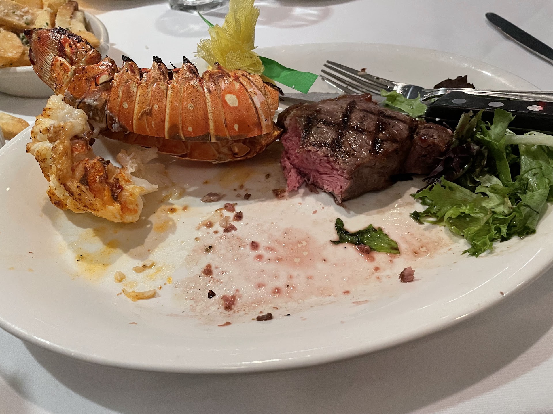 We shared the Ribeye. It was 16 ounces and very flavorful. It was perfectly medium rare and lightly seasoned and actually not that much fat.