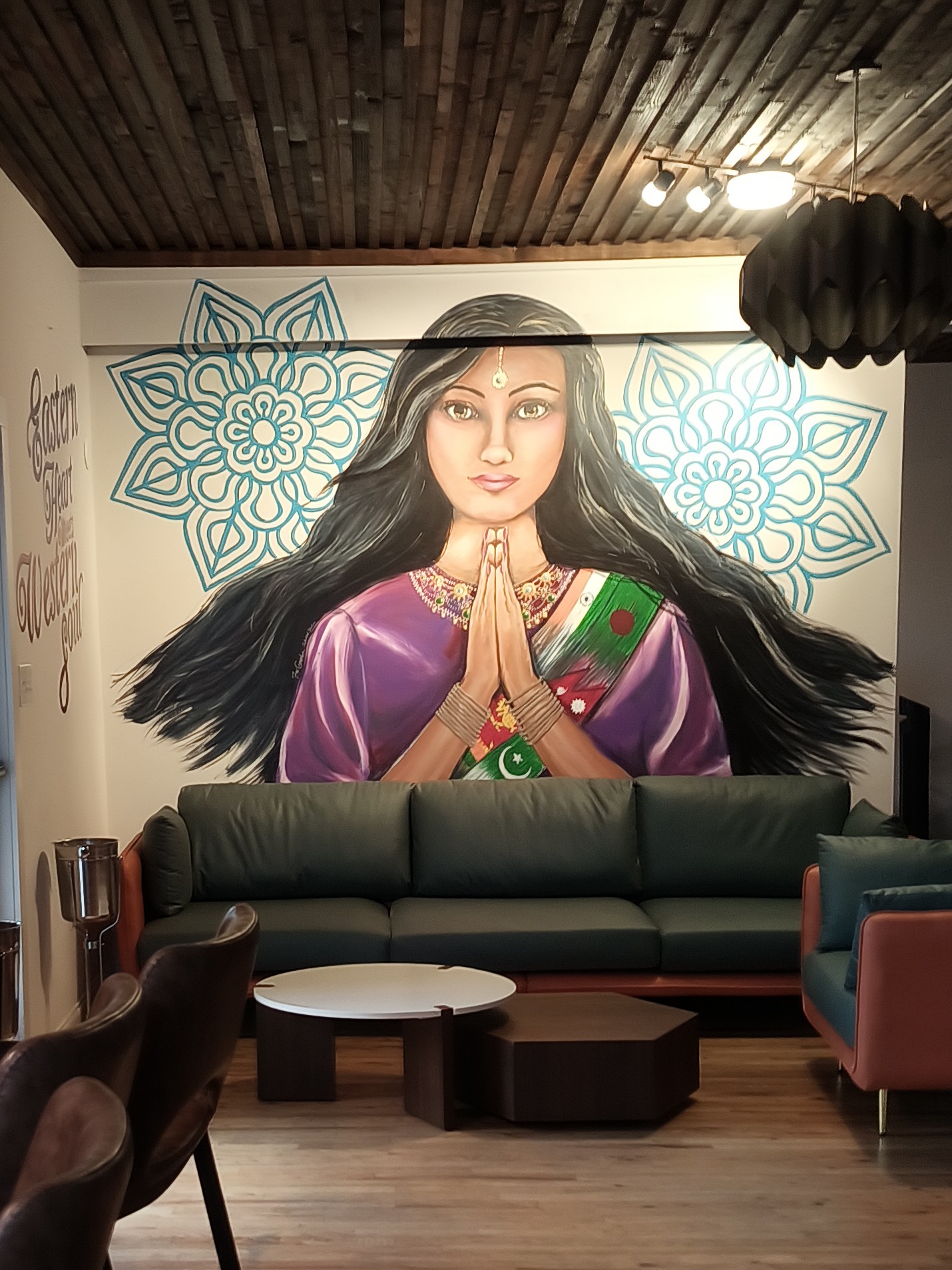There was no Indian music playing, just easy listening covers of popular old songs, and the TV was showing stock footage of Italy for some reason. Indian music videos or Bollywood movies would be much cooler.