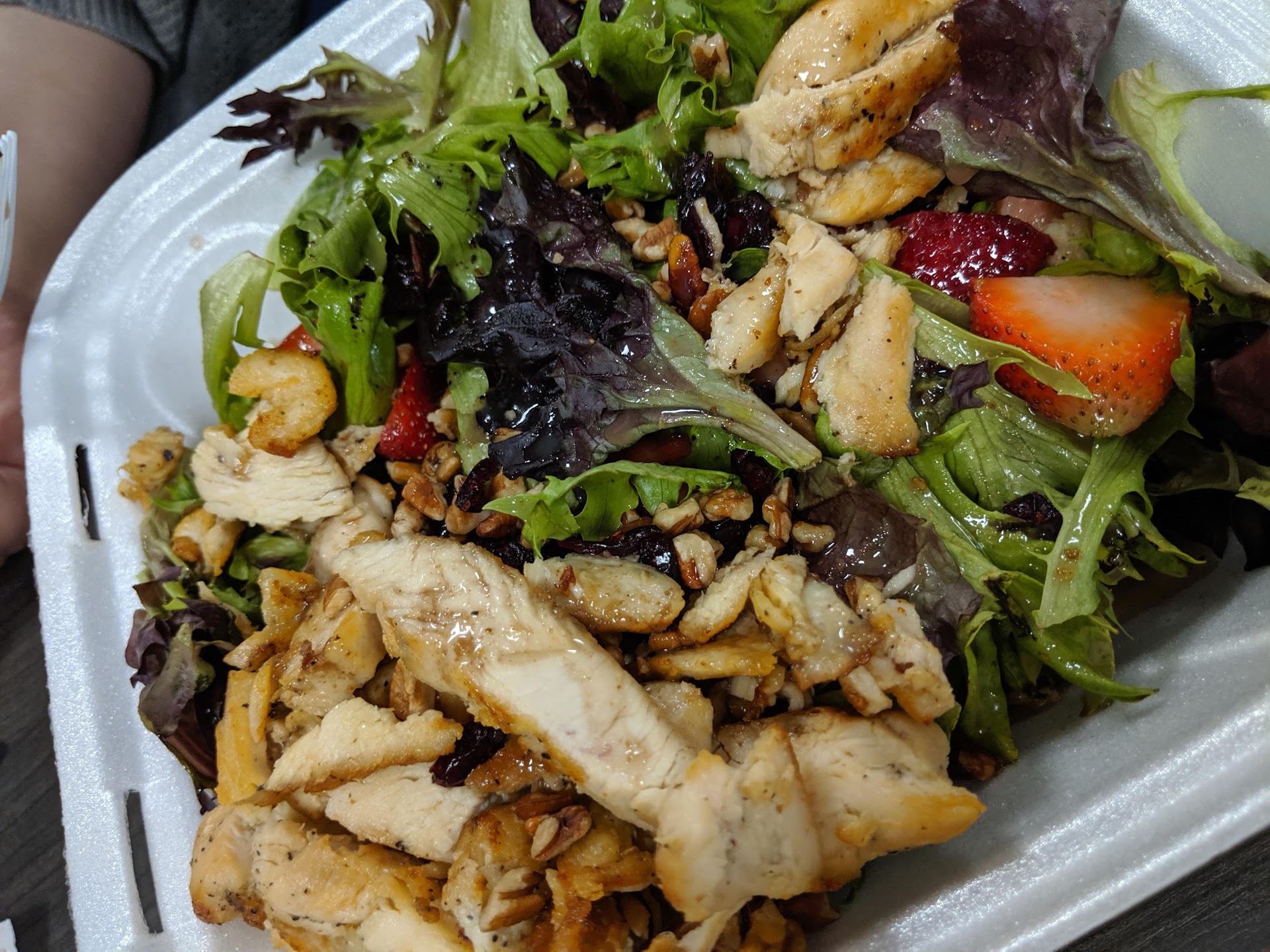 Read moreI've never had bad food here, I took off 2 stars and I'll explain why after I tell about what's good. I usually get the grilled shrimp wrap, it's dressed a lot like a gyro, and it's super yummy. They have an awesome Cobb salad, and really good chili as well. I took off the stars for a couple of reasons, they charge $2 for a side, whether it's chips or a cup of soup, chips with a sandwich is pretty standard for a place like this, but $2 for plain chips (only option) is pretty steep to me. They also say on the menu that the lemonade is homemade, but you can plainly see canisters of Countrytime Lemonade mix next to bottles of concentrated lemon juice on their back rack from the counter you order from. Lastly, this is the south, and I don't know a single person that eats soup or chili with club crackers, we eat saltines, they...