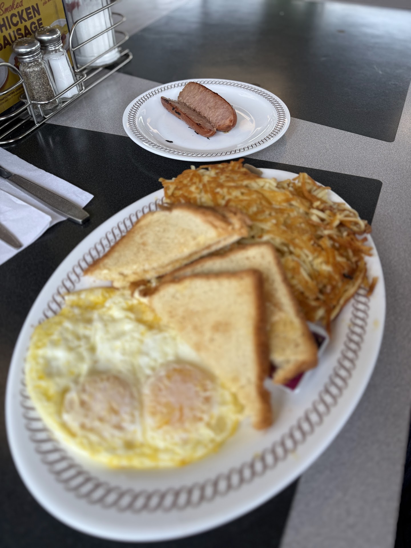 Well the waitress wasn't very nice, and I almost sat down in spilled milk that the waitress didn't bother to clean up from the last ppl that sat in that booth last, and she didn't check on us one time to see if we needed more to drink so we did without. The food was fine just lacked attentive service from waitress. And THEN to top it off, on Christmas we was staying at Motel 6 and was hungry having not had anything to eat on Christmas and my husband walked over there to get us something, saw ppl inside, yet got a hand motion from a blond headed short lady very rudely telling him they were closed. This was one important factor of us staying at Motel 6 having a 24hr place to eat since we had no place to cook. This was so very disappointing going to bed hungry on Christmas. I wouldn't give this place 1 ⭐ but had I not I wouldn't have been able to reveiw.. I have traveled alot and from Colorado to here this here is the worst waffle house I've ever...