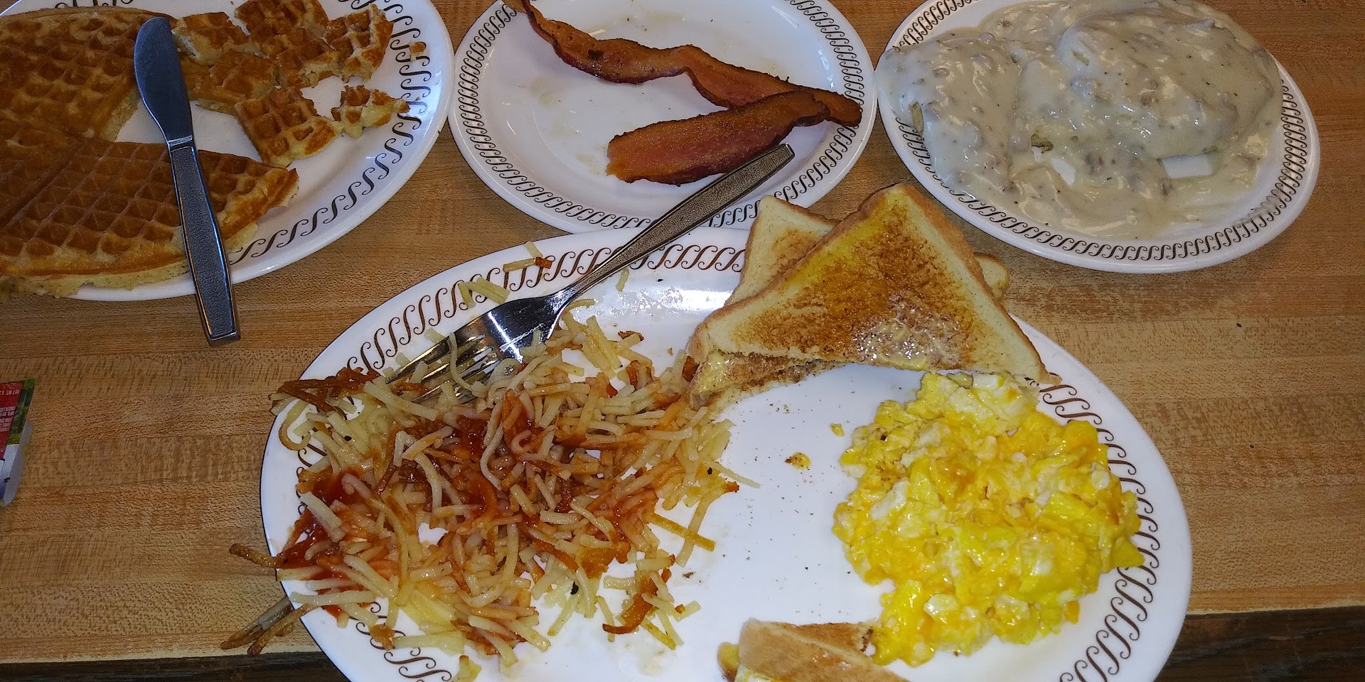 Read moreThis was by far, hands down the best Waffle House experience I've ever had. Parking lot wasn't crowded. Came right in, sat right down, food was served quick and tasted amazing. Nothing wrong with our order. Received our ticket quickly. Entire restaurant was clean including the restrooms and parking lot. Atmosphere was chill. "The regulars" were great to be around, and our waitress was so very kind and didn't pester us. I've never left more than a 20% tip, but this time I left 50% and complimented our waitress for the great experience. This first visit was on a weekday morning and every visit since then has been just as good. I think it helps that it's kind of hidden off the highway and is accessed by a side street. I rarely leave reviews like this, but great service deserves recognition. I was shocked to see it had 3 1/2 stars. Guess some of the people who rated it low isn't familiar with the Waffle House culture, food service industry, or how to be polite in exchange for polite service. Kudos to ALL...
