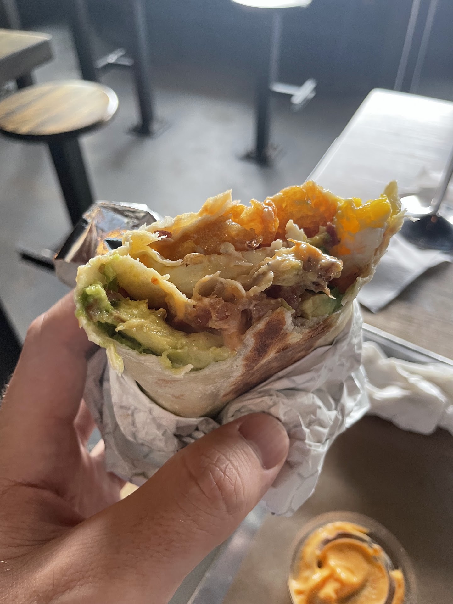 I would say between 5-10 mins she brought my food out and gave me some spicy mayo. Which was amazing. The burrito had some crunch with the over easy egg inside made it all so yummy. The fries had the right amount crunch. 😋I was watching F1 qualifying on my phone while enjoying this yummy meal. The place was clean and the environment seemed lovely. Would definitely come back again for a burrito! 🌯