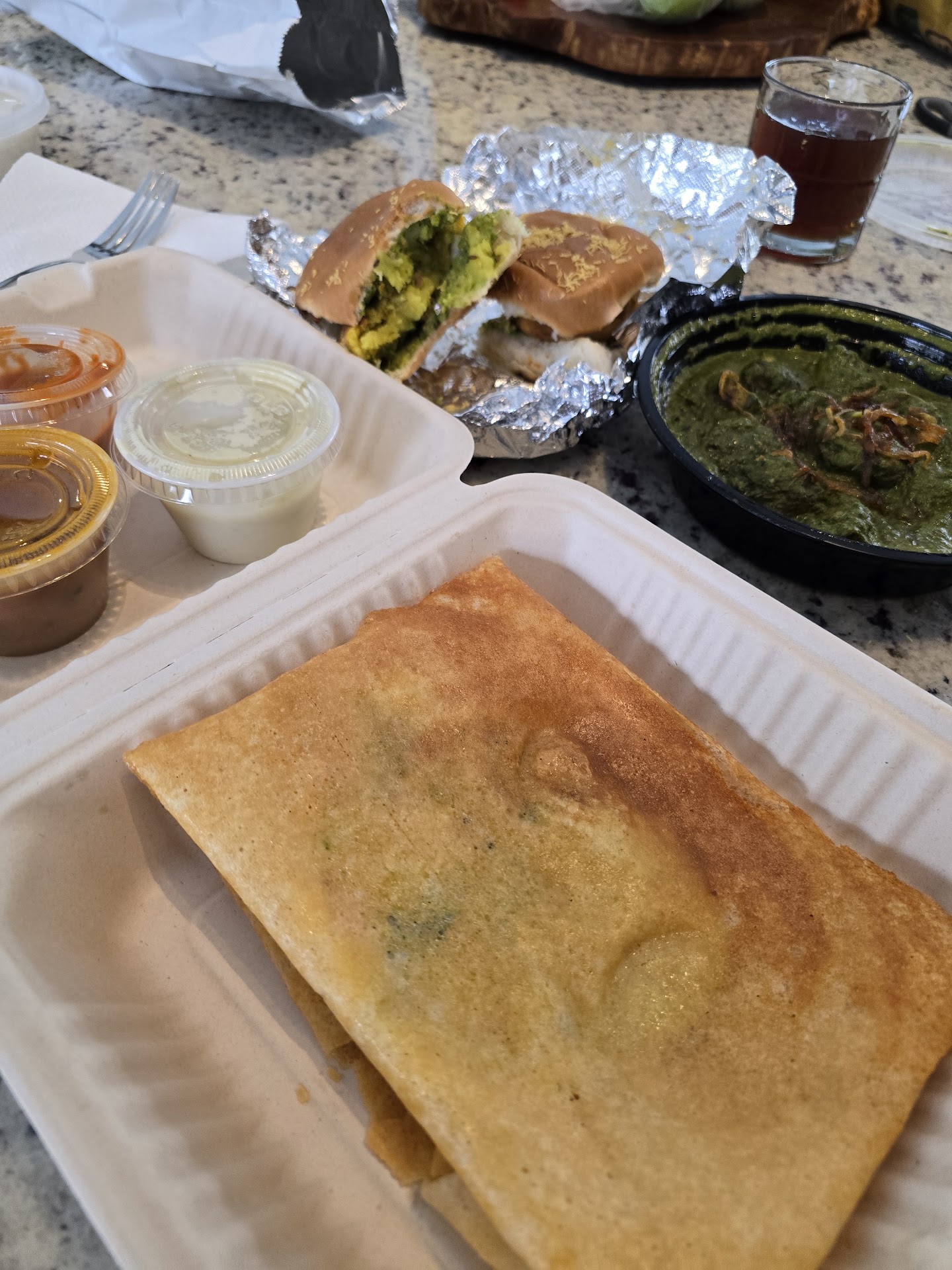 Ā Ā Ā Read moreOMG, OMG, OMG! I haven't been this happy with a food delivery order in years! We ordered through GrubHub. I'm a potato fanatic, so all three dishes I ordered contained potatoes. š Masala Dosa, Vada Pav, and Saag Aloo. You can choose your level of spiciness on the Saag Aloo - I went with "American" and honestly probably could've gone up by 1, but have friends who would've found the American level spiciness just right for their pallets. The flavors were spot on and the dosa was apply filled, unlike some other places I've been where it's just a smear of basically flavorful mashed potatoes. These were lumpy and and oh so good! The Dosa came with three difference sauces/chutney (see photos). This is the first time I've ever had Vada Pav. I thought I was the only person who puts cilantro chutney in their sandwiches...didn't know it was thing. I totally thought I made that up. These little potato ... ... sliders (?)... ... we're just šš in flavor, consistency and pure joy. I have no reference for what these should taste like but if it's anything different than this, I don't want it! Finally, the Saag Aloo is a dish I've had at nearly every restaurant. What was different here was the potatoes were a nice size and not cut into tiny cubes which made for a nice balance of flavor. All the food arrived piping hot despite traveling from the Kentlands down to near MacArthur Blvd in Cabin John, MD. A testament to both the delivery driver and the restaurant handing the driver a...