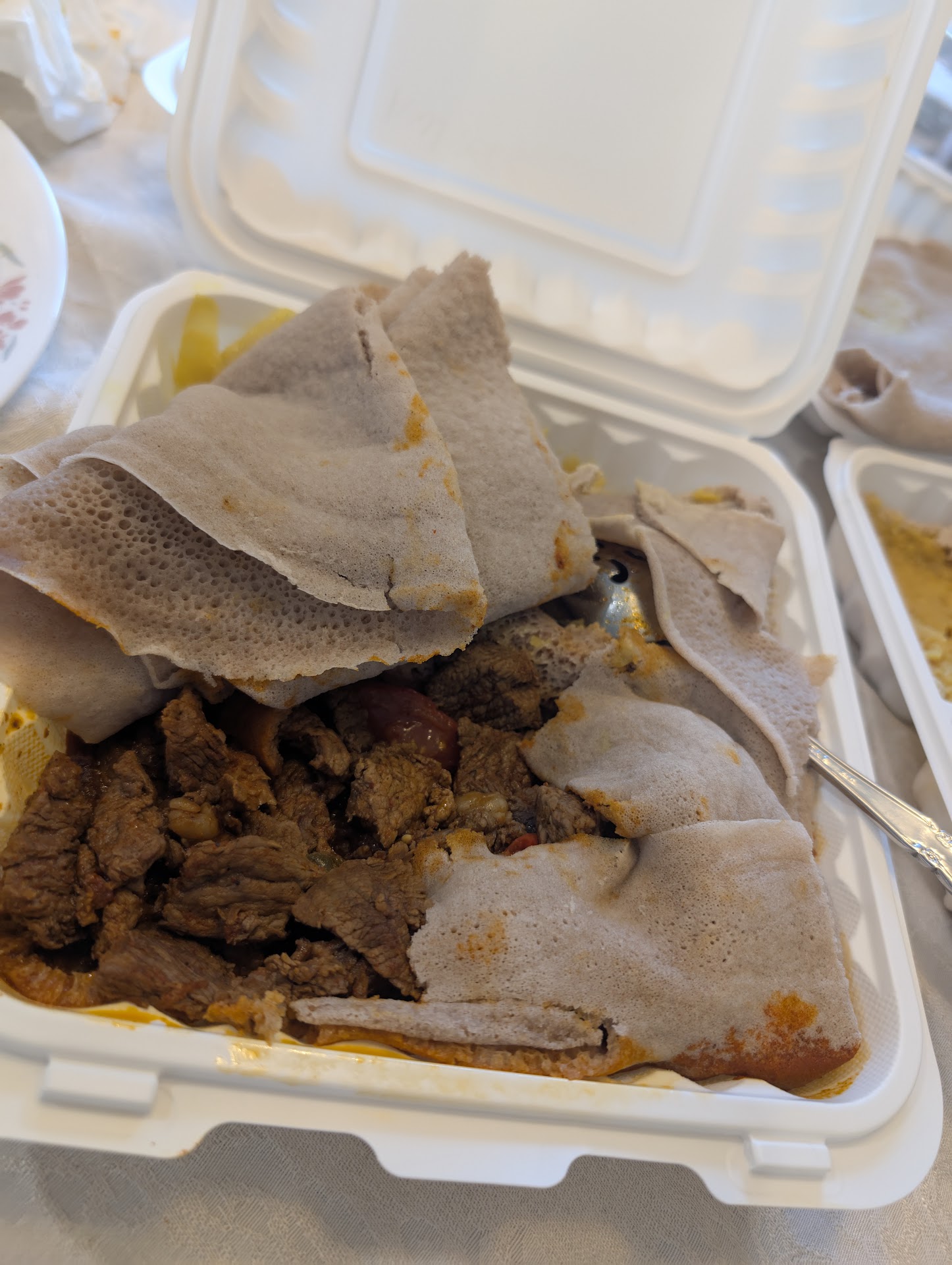Great! Stumbled upon this store accidentally. I was excited that it was an Ethiopian food carry out. They do have a few tables to dine in. I am American however I love spicy food. I ordered the vegetable combination platter and the beef combination platter. (Forgot the names but I believe the vegetable platter had the wats and the beef platter included tibs. The portions are huge and you really get your money’s worth. And the food is absolutely delicious! The beef had absolutely no fat or gristle it was very soft. The vegetables-which included yellow split peas, cabbage and others were very complex and just as delicious. The injera bread is to die for. I just found out the injera bread is homemade and everything is organic and non gmo. This is very important to me as I am a cancer survivor and do not want my food to have toxins. I understand it is very popular with the Ethiopians which is a great sign of a good restaurant. Our 2 combo platters gave us dinner for 3 different days and they were large portions! We will definitely be returning. I want to try their kifto- raw meat marinated in spices- which I understand...