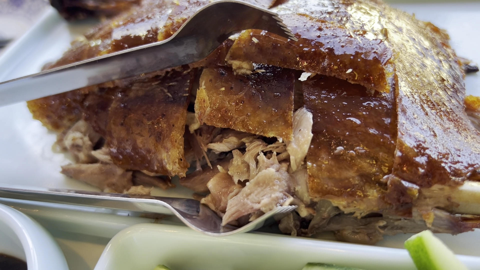 The duck meat was tender, but the skin was a bit too thick. The dipping sauce was served in a rather small portion, and the pancakes were slightly soggy and stuck together. The cucumber strips weren't as fresh as they should have been, showing some yellowing and dryness. The scallion strips were slightly old, with one or two pieces that were tough to chew.