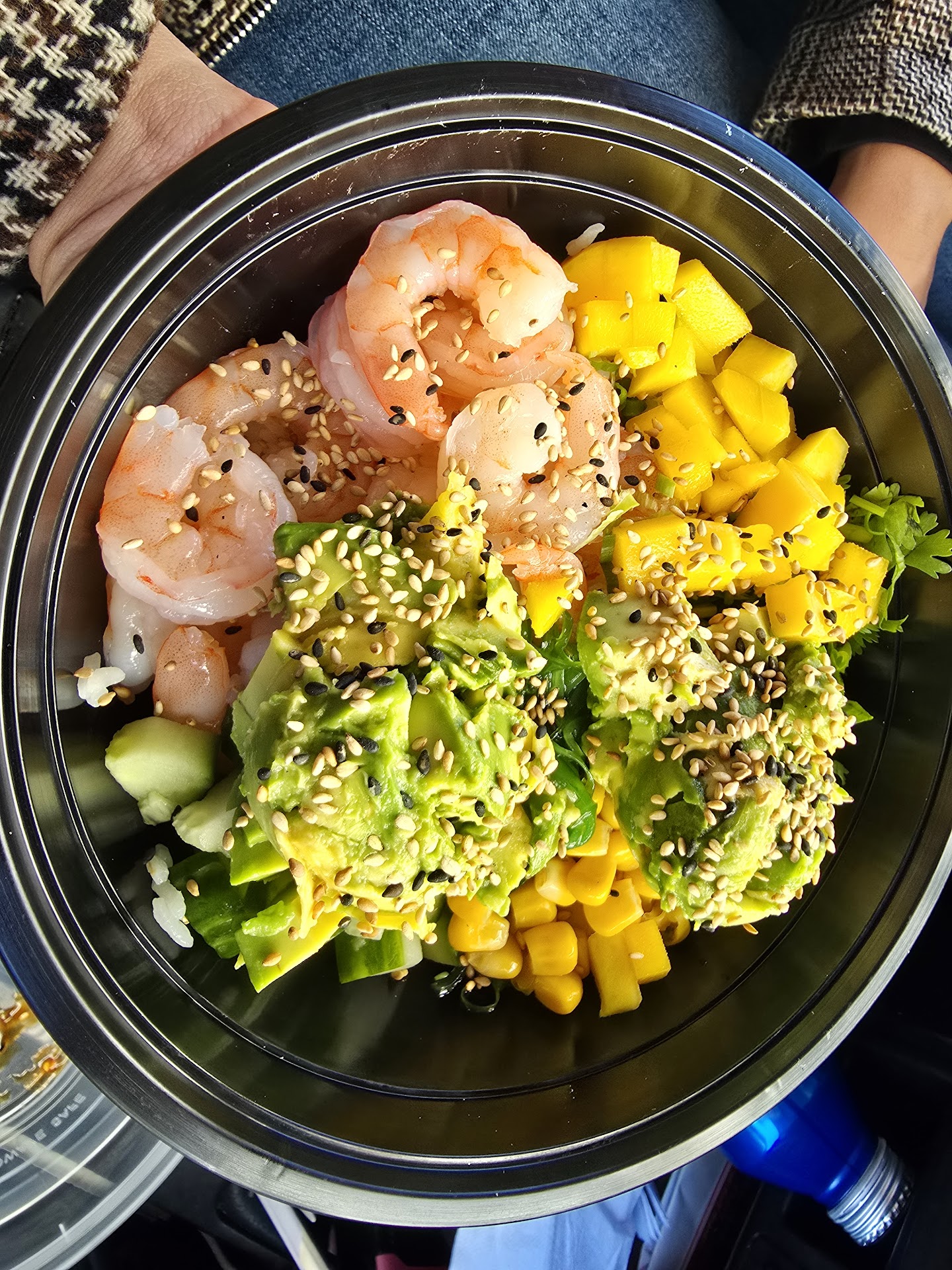 I got the salmon tuna combo with sushi rice, lettuce, radish, jalapeño, pickled onions, sesame seed, honey Wasabi, mango, and Sriracha.