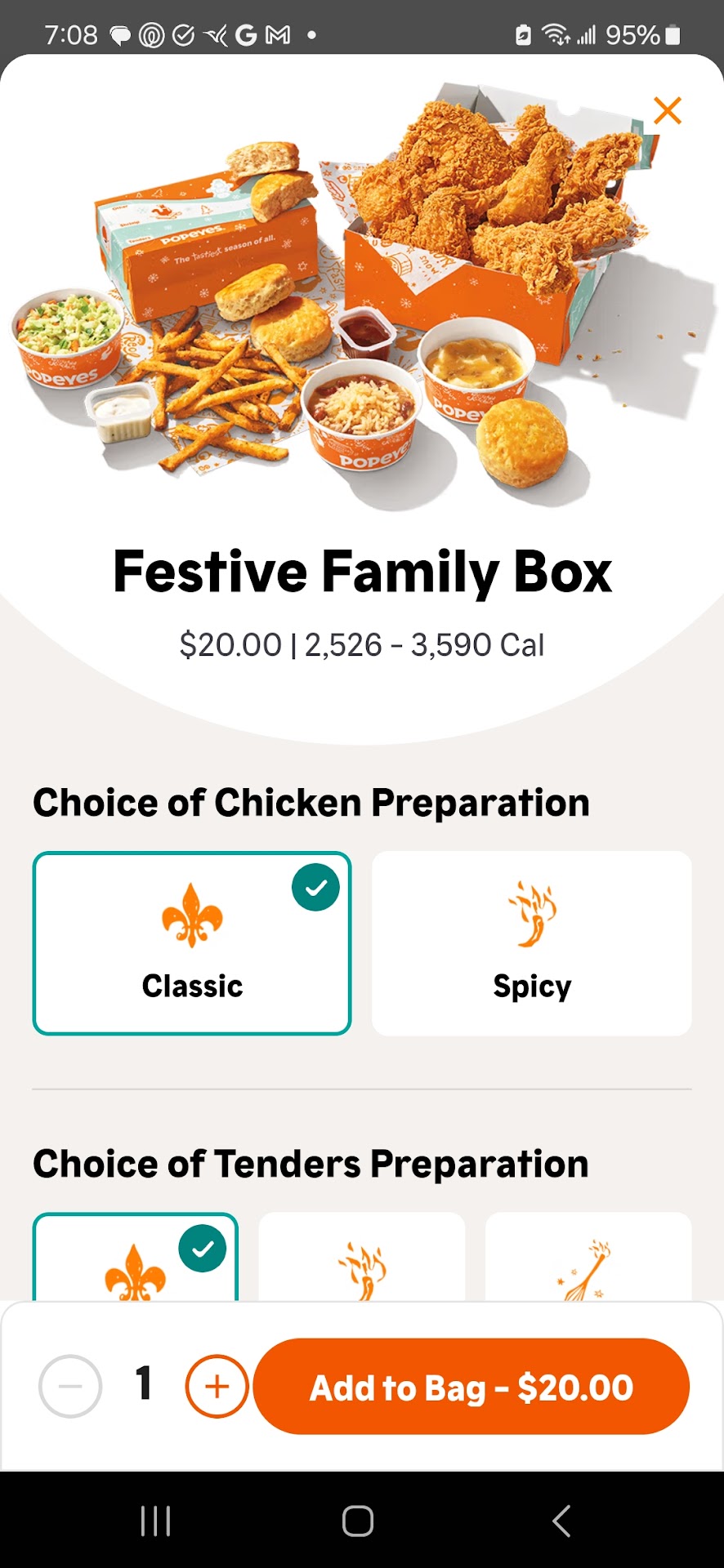 I ordered a special using the Popeyes app, which suggested and offered me the Festive Family Box for $20. With one upgrade, the price was $20.50 plus tax. The app asked me to confirm the order by item, not by price. When I paid, my card was charged $39. Later I found out that was the full nondiscounted price of each individual item.