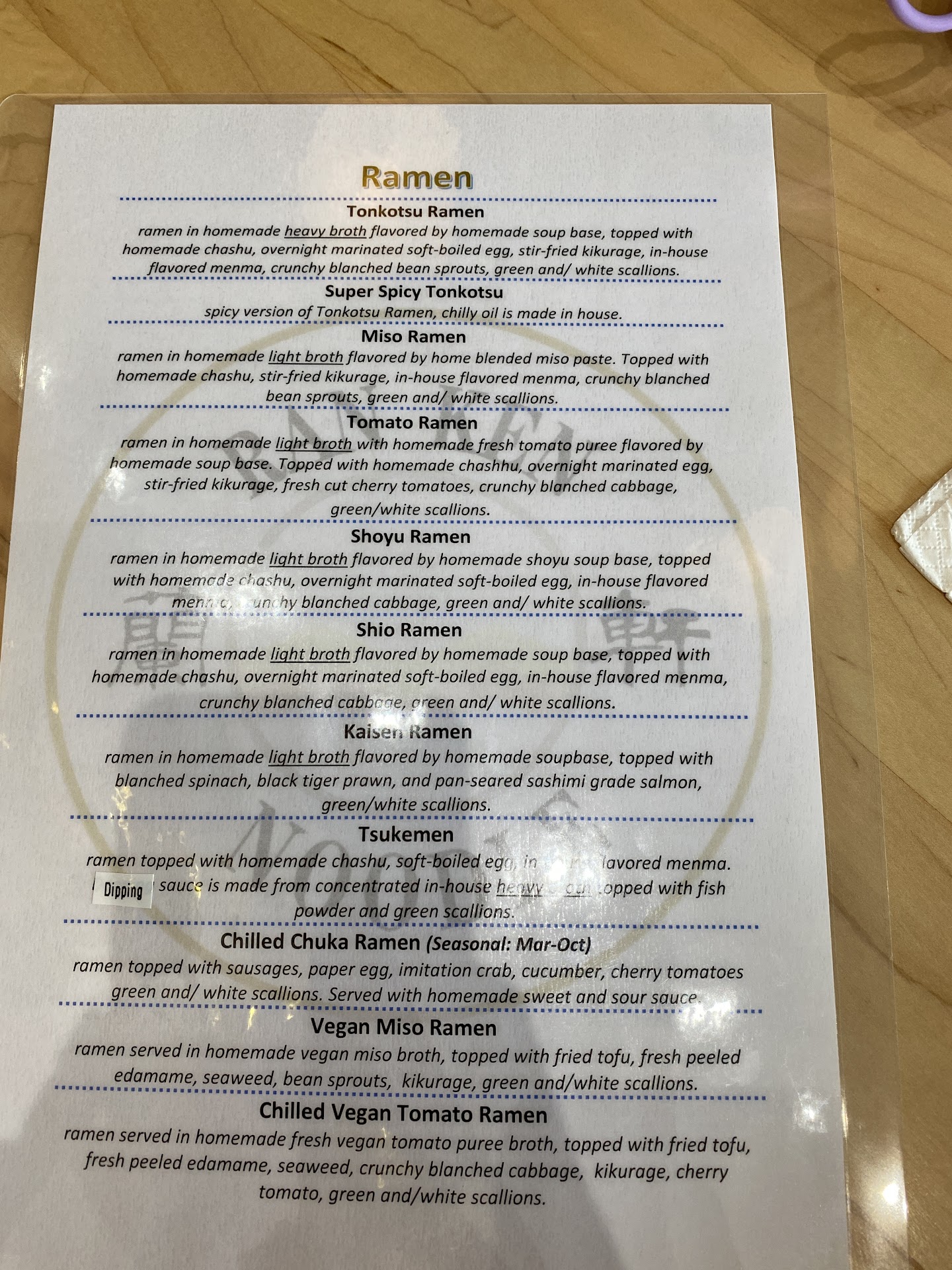Edit: I’ve been back after a long home made ramen phase. Management has updated to include description cards, I have posted them. We had the shoyu ramen again as well as the tonkotsu ramen. Tonkotsu broth can be very overbearing, however this was not the case. The shoyu was an elegant and light broth as usual, while the tonkotsu was a filling savory broth. Very well done on both. Food still came out quickly and hot.
