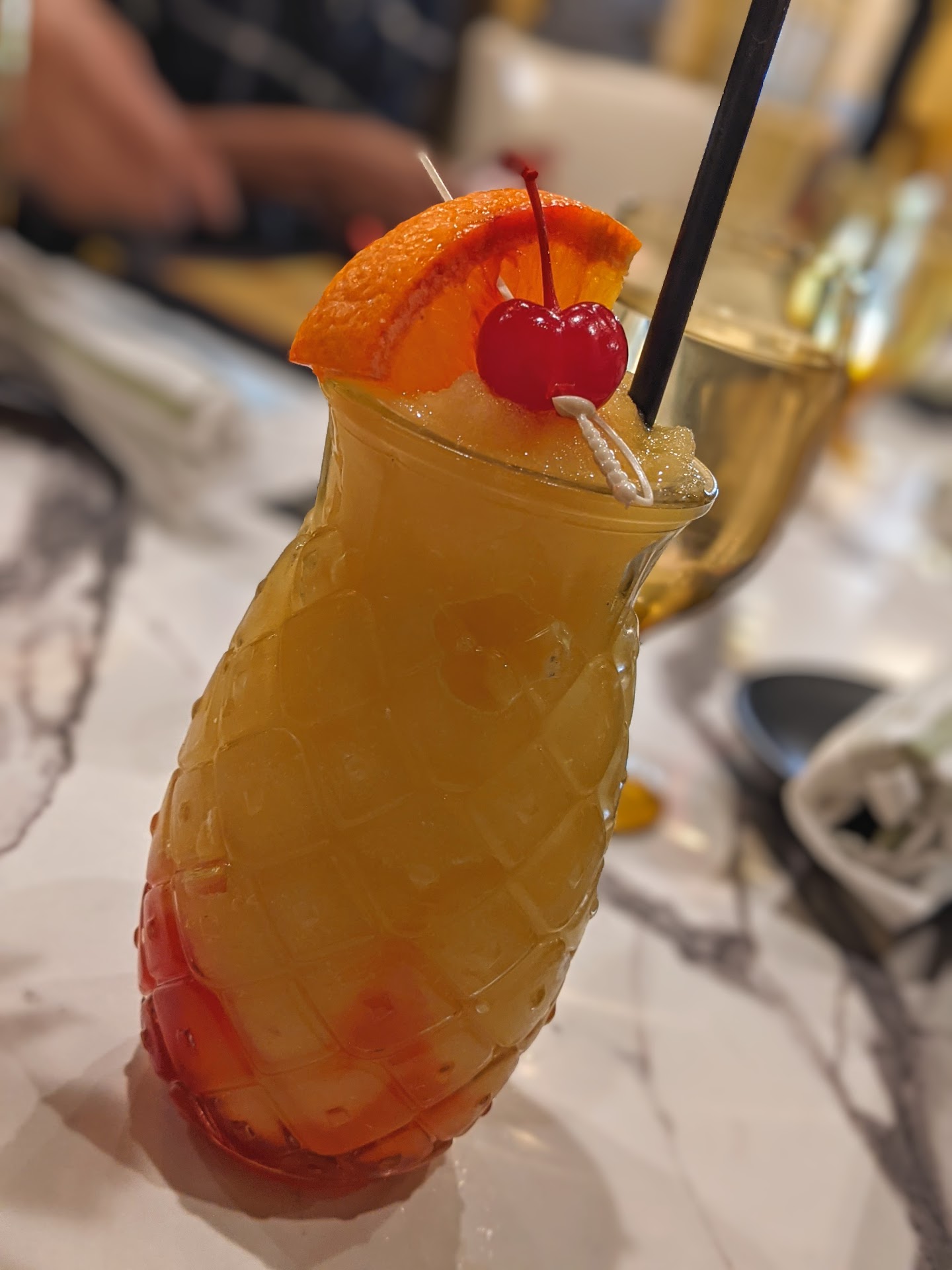 Besides water, I enjoyed a Mango Lassi, which consisted of a clear pineapple shaped glass with streaks of maraschino syrup and mango lassi and garnished with a maraschino cherry on a plastic sword. It was mango-y and refreshing. It wasn't too thick or runny. It had a nice balance of yogurt, milk, mango puree, and spices.