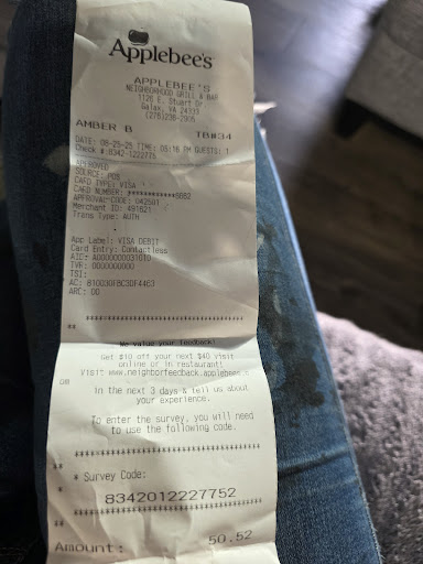 Ā Ā Ā Read moreI'm only giving it a 2 star because the wonderful waitress who stepped in to actually get our order turned in was great. Our original waitress took our drink order (waters all the way around) and the food order, went back toward the kitchen and that's the last we saw of her for over an hour. The other waitress in our section, and forgive me but I can't recall her name, finally asked if we'd been waited on. I explained the other waitress just left us high and dry so the good one took our order and brought us water. We still waited over 30 minutes for our food, which was good, and then lo and behold, the first waitress wandered over to see how we liked what we were eating! I gave her the rundown of my grievances, she muttered something about dyslexia and went away. This was my 3rd trip to this particular Applebee's. The first trip was awful and involved gross, sticky tables and trying to order food that they apparently had run out of. My 2nd trip there was great... Good service and good food. This trip? May have been my last. After being in that restaurant for over 2 hours last night, I wasn't even offered a free dessert. Haha. Probably just as well because I'd still be there waiting for it...