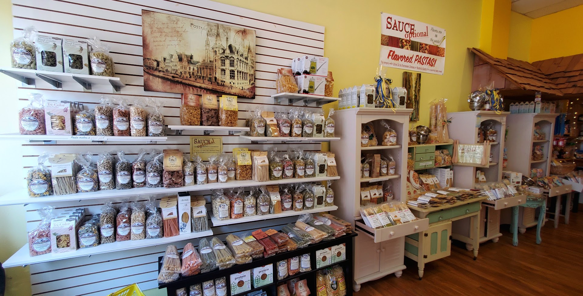Whatever comes to mind when you picture "pasta store" I can assure you this unique specialty store will exceed expectations. Squid ink pasta, rainbow pasta, sundried tomato pasta... all available in every shape under the sun. Novelty shapes in everything from your favorite sports team's logo to princess crowns and cat paws. Cooking gadgets like ravioli stamps and spaetzle graters and--my personal favorite--bow tie pasta shaped pot holders. Seriously, you name it, they've got it. I can't recommend this place enough, whether you're looking for a unique gift or a foodie on the hunt for something special for your next night in...