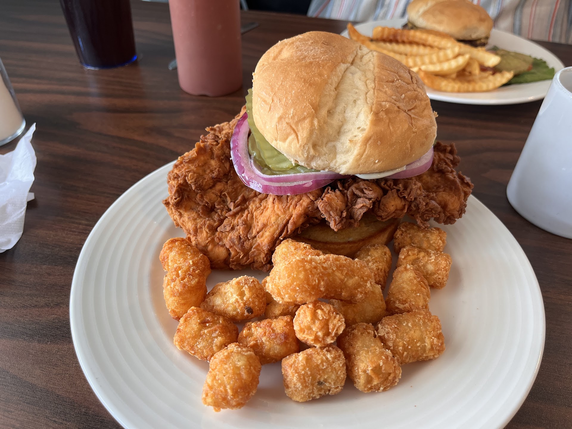 We were sorry not to have been there in time for breakfast, because my husband loves biscuits and gravy but our lunches were everything we could have asked for. He had the grilled bacon chicken melt sandwich and was so happy that the chicken was cooked perfectly (unlike so many restaurants). I had the pork tender sandwich and was delighted that it was a real piece of meat with a crunchy coating, that was bigger than the bun but not what my husband likes to call a Frisbee (meat pounded to death and more breading than meat). The sandwiches, the French fries and the onion rings were all top notch. Our meal took a while as they had just been hit with an unexpected party of 26! with no notice. Our server explained the situation and we were happy to wait. It was definitely worth it. Galena is pretty out of the way for us, but we'll surely be back to...
