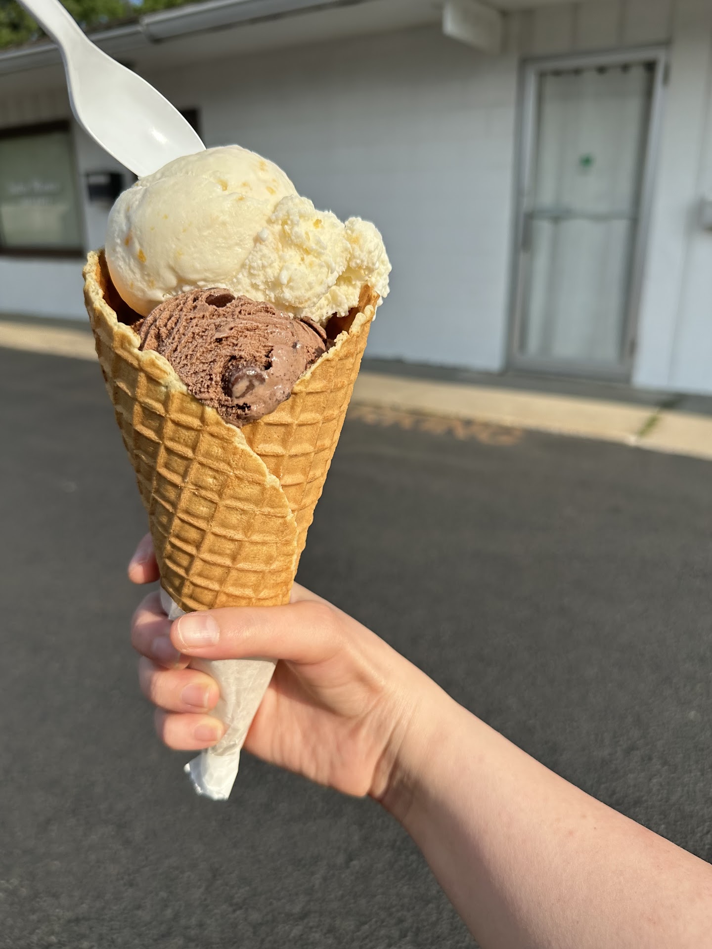 The waffle cones are handmade and they make them right in front of you. They recommended it to me and boy am I glad they did. It was SO tasty! I got 2 flavors: Michigan Pot Hole and Carolina Peach. As you can see in the picture the cone & ice cream scoops are really big. Such a great deal for the low price!!