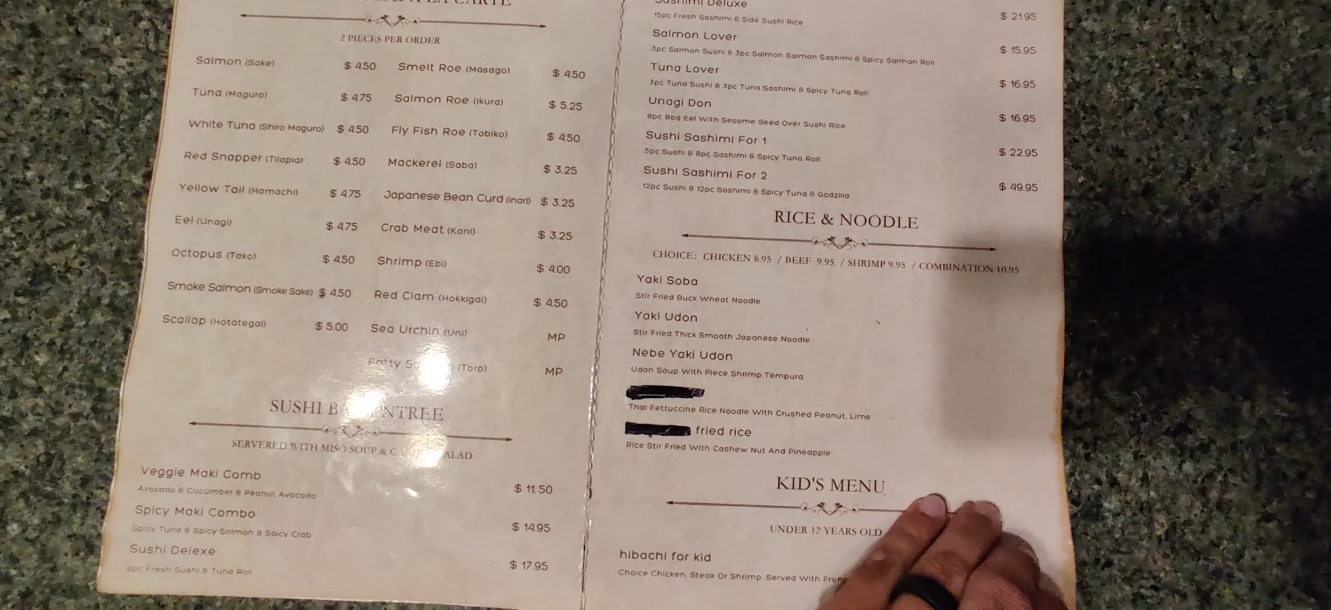 Read moreWalked in and the place was empty. There was a gentleman at the bar and asked how many we said 2 and he pointed to a section of booths, so we found a booth. Within site of the kitchen...not a good move. He dropped a couple of very dirty and broken menu's, asked what we wanted to drink. Promptly bringing a foamy cup of tea and a glass of hot water of which I asked for with lemon but arrived just a glass of hot water. We perused the large menu for a minute. I was almost going to leave since all I could see were the filthy walls and dirty dishes cart (I believe we might have been the first customers of the day) assuming the dishes were from the night before. Ordered tempura veggies and rangoons. The rangoons were good, the tempura veggies lacked any flavor what so ever. Our "lobster" roll was anything but lobster. A definate fishy smell..and whatever it was made with, looked discolored and old. I couldnt finish the roll. In our quest to find a good sushi place and after driving from Peoria to try Masa, we wont...