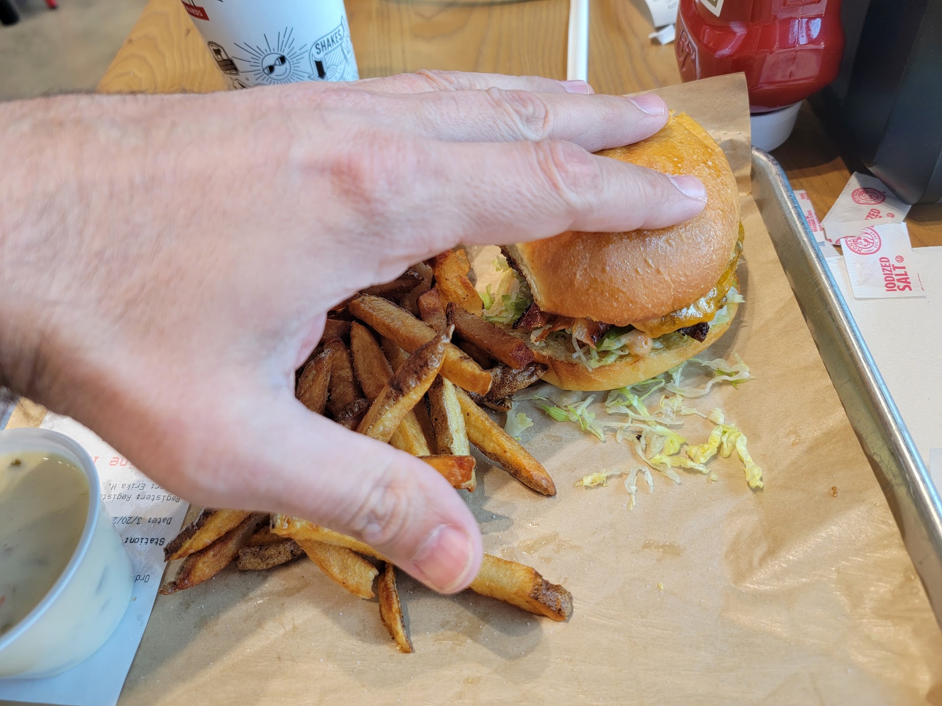The verdict: first impression, the burger is tiny (see hand pic).. offensively small for a $9 (a la cart) burger. The bacon, being in the name, was lost in the burger.. such is extra impressive considering the nearly slider sized dimensions. Limp and greasy, this had to be microwaved bacon.. such as you might get at subway. The meat was so small that if it did have flavor, it was lost in the scheme of things.. i barely noticed it. The overall flavor of the burger was ok.. no structural issues, but it wasn't big enough to get them. This burger was so underwhelming in every imaginable way.