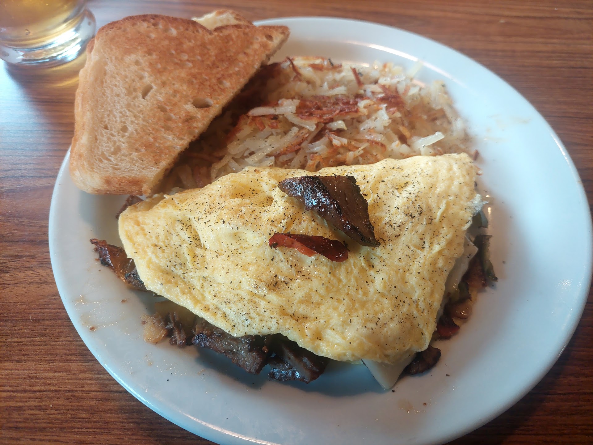 Within minutes I was seated and placed orders. The waiter/waitresses were very attentative. To my surprise the food arrived so fast I thought the server had returned food to the incorrect table. The food was served hot. The steak inside the omlette did not have a lot of flavor but it was just right, tender and very well done. The homefries were fresh and not recycled. The apple juice was nice and cold and I highly recommend the sour dough toast with strawberry jam to round out your omlette. I completely eradicated this meal on Day 1.