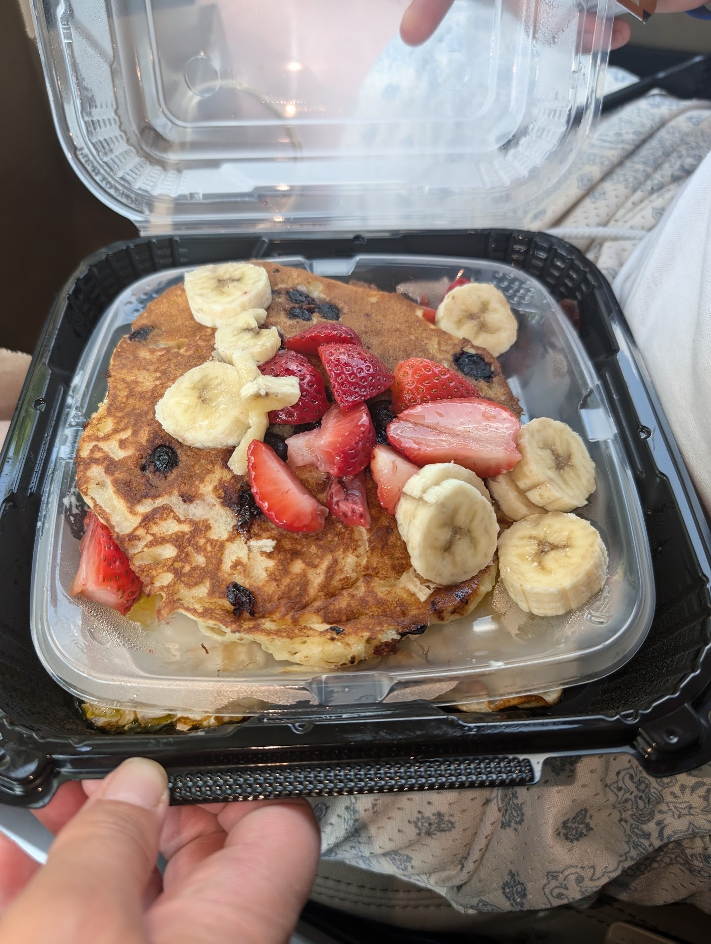 Thank God for Denny's. On a recent trip, my son and I were really disappointed with a family campground we checked into with the dog. We ultimately packed up and found a pet friendly Days Inn located in Absecon, NJ. In the evening we went to see Impractical Jokers live in Atlantic City. The show was great btw, should they ever "drive drive drive" into your town! The following morning we were still exhausted from all the packing and unpacking and decided against the hotel breakfast opting to sleep in and barely made an 11AM check out! If you've never been to Absecon or Galloway you're missing absolutely nothing, and there isn't much to eat. Unfortunately, both Denny's near us closed down and of course it was always a late night must. I told my son all about my favorite thing the "moons over my hammy", and of course those infamous slams. Well my son ordered the very berry slam and it looked amazing. A double stack of blueberry pancakes, loaded with a mountain of fresh strawberries and bananas, 2 eggs, your choice of potatoes (he got the shoestring hash browns) bacon or sausage. Not bad and I think it was 12.99 very reasonable prices. I got a value meal for 7.99 2 pancakes a generous portion of fluffy cheesy scrambled eggs 2 bacon 2 sausage although I got all bacon. What a deal for all that food! We ordered online and ate like weirdos in the car. Upon arrival at the store roughly 10 minutes after ordering I was greeted by multiple friendly staff in an extremely busy restaurant. The place was packed. The barrage of online orders and in person customers was dizzying. This place has their stuff together. The packaging was also really smart. The pancakes were nestled in their own little hammock like container within a slightly bigger box below that contained the other items. Honestly I don't know if it was because most times I was at Denny's was 2AM but I don't remember the food being so tasty. They also have a full menu of lunch/dinner items but honestly, what kind of psychopath would order a sale...