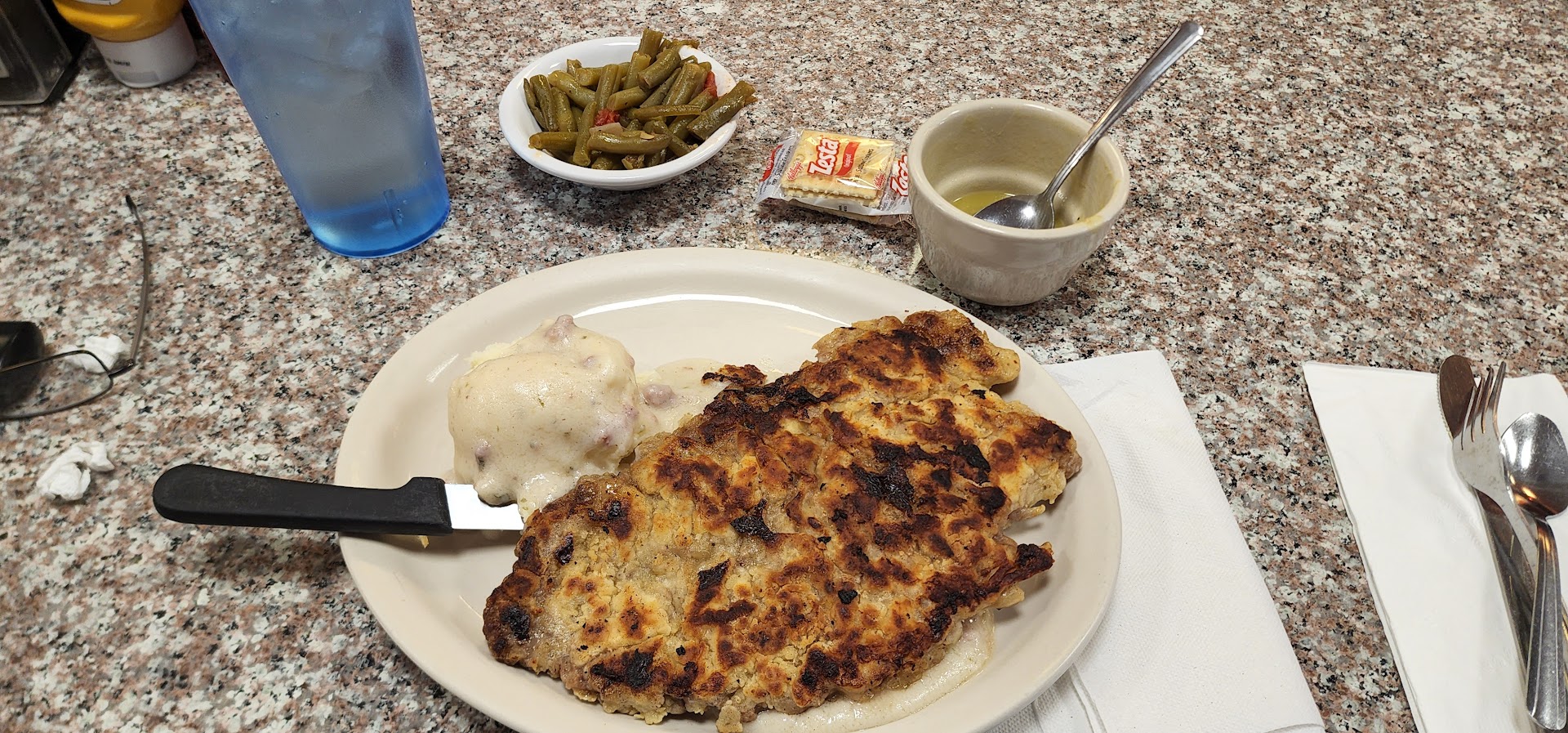 If I had the option to give no star I would! I only have these pics but after eating here and talking with the owner I wouldn't recommend this place to anyone. My family has been coming here for decades and I have never been treated with this kind of service in my life. My family and I walked out unsatisfied with the way the hamburger steak came out and the foil in my chicken fried steak plus the burnt pizza crust my son got. The service we got from there on from the waiter saying it hand nothing to do with him to the plate that got sent back only to get that same plate back to get another burnt piece of hamburger worst then the first one they brought out and to my son's hard crust, half burnt pizza to the foil I found in my chicken fried steak. That's not even the end of it! When asked to speak with someone in charge they told us to write a note on our receipt or call the manager. Trying to be nice and not wanting to walk out on our ticket, I questioned who the acting manager was while the one was at an appointment. We had to wait for the owner to show only to have him give us an excuse after another about how his company was suffering from the pandemic and telling us that his distribution was not the same. However, that was not the issue at hand, the food was not prepared right and overall, we gave up and said the HELL WITH THIS PLACE! WE PAID OUR TICKET AND LEFT UNSATISFIED! So here I am writing a review... I give this place a BIG ZERO!!! NEVER GOING BACK! THANKS FOR READING...