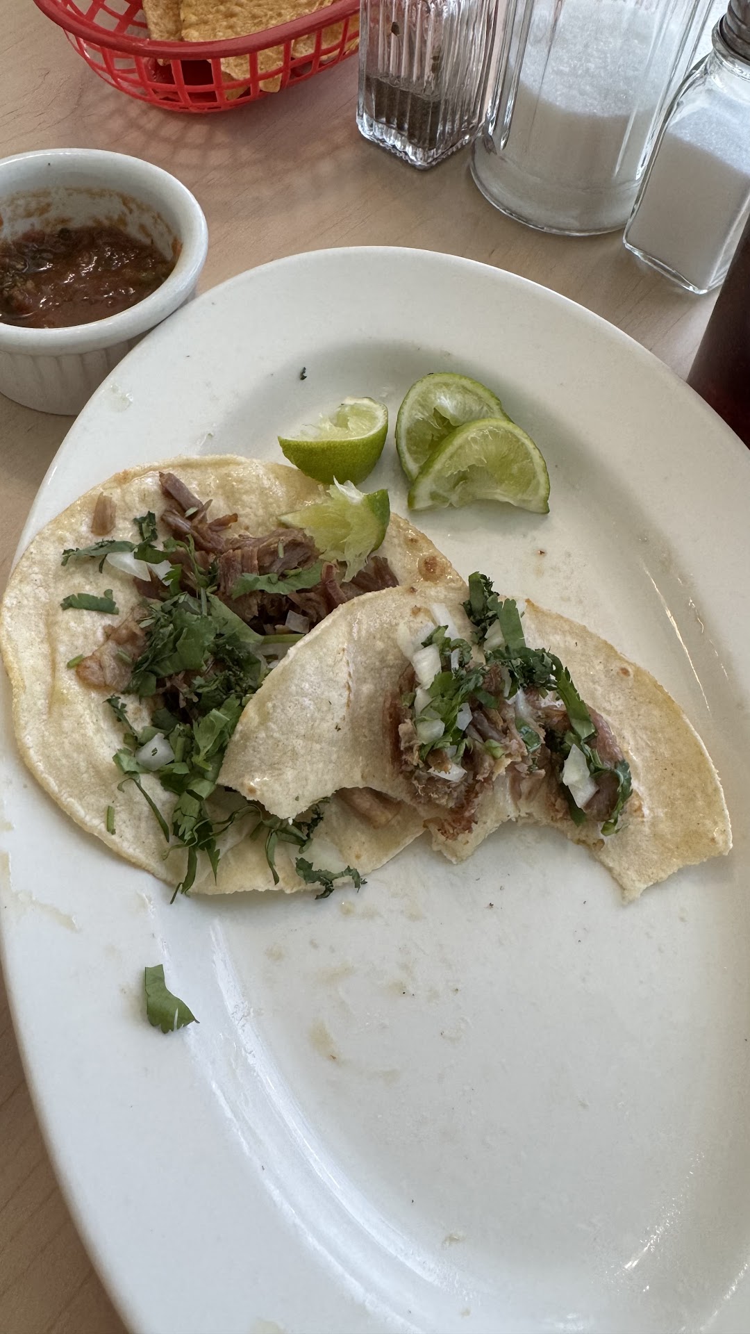 Georgette our server did a great job with an on-time arrival of drinks and food. See the pictures. I had the Big”lunch offering and my wife had the street tacos. Portions were good and everything tasted great.