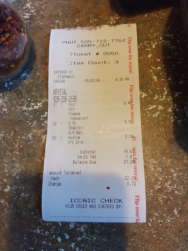 Read moreUnable to rate the food. Didn't have a chance. Mind you i had a party of 9. They close at 10pm its 8:30. We enter the door, and as I'm waiting at the host stand, the young lady behind the counter sees us and gives the biggest eye roll and huff of the chest. I didn't want to assume, so I waited for her to come close. As she came to the stand, not a hello, not a welcome.. question: Do you want to dine in? It's not a bad question, but when you added in the deep sigh and side-eye before it, I had to clarify. I say" we'd like to dine in but did you not want us to? She ignored my question, asked the question again with an irritation in her voice, also noting the farther part of the loddy is closed, and she will put us in the 2 small booths. Not sure how you'd feel but me? I'm not putting food in my mouth where I'm not wanted. If only she knew how well I'd tip for good customer service. Hope her days forward go alot better. We left and went across to Burger King, which to our delight was a huge contrast! Not only were we greeted but welcomed in to eat and she spoke to our party thanking then for coming in. Not pizza, but worth it! Thank...