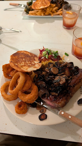 The Old Fashioneds, one bourbon and one rye, were a great lead in to the The Big Ol Steak and a Lil Steak. They were cooked as we requested (one rare and one medium-rare) and accompanied with sauteed mushrooms, loaded baked potato, onion rings, French fries, and Brussels sprouts. All was fantastic. My wife raved about the Brussels, and we enjoyed talking with Crystal about how she made them.