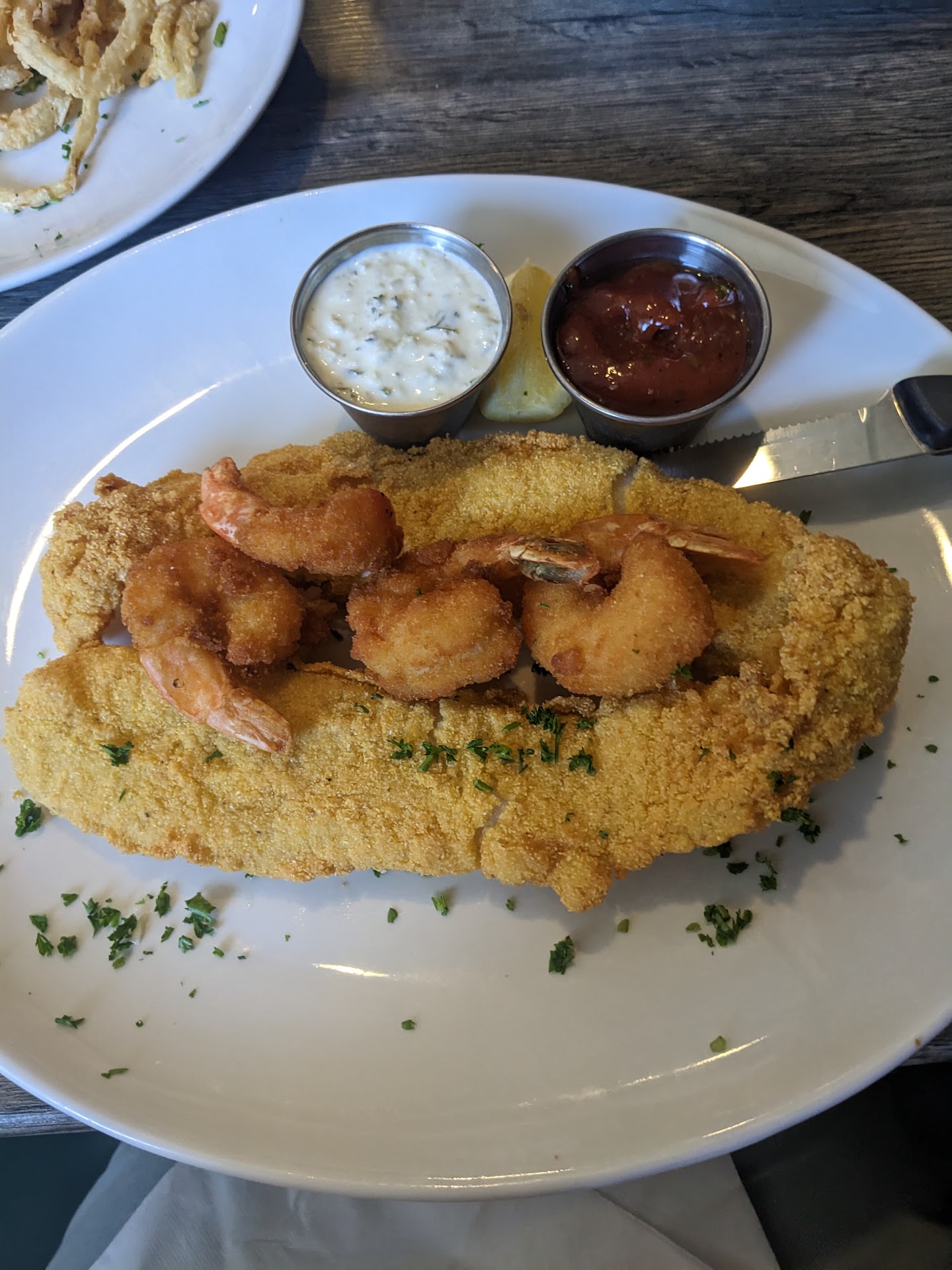 My wife had fried shrimp and oysters. She found the crust on both of them also too hard and tasteless.