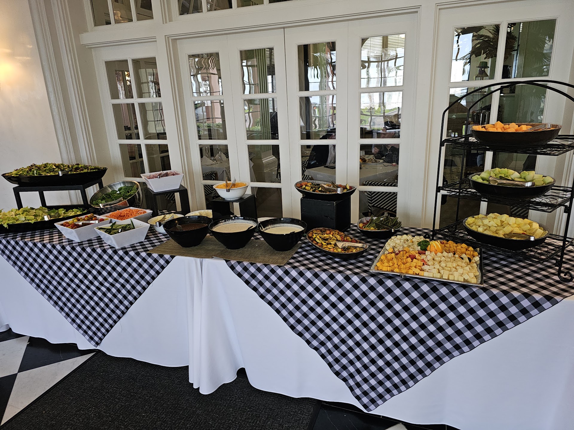 A funny table with some green stuff on it that I paid zero attention to. A bread station. Then on the left you had eggs, bacon, sausage, and a eggs Benedict. Mashed potatoes, jerk chicken , biscuits and gravy I'm sure I missed something but it's all in the photos.