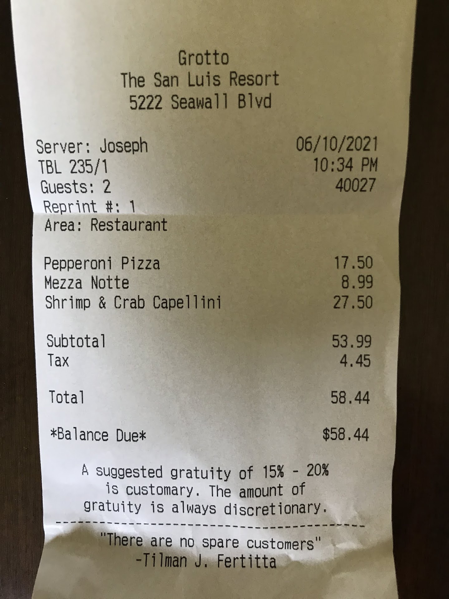 We recently dined at Grotto in Galveston as a party of six, and the standout of the evening was our wonderful waitress, Chloe. She managed to meet the diverse needs of our group with ease and warmth. From my own gluten sensitivity, to my children’s pizza cravings, to my elderly in laws who needed a little extra attention, she took care of everyone without missing a beat. Her attentiveness set the tone for a smooth and enjoyable evening.